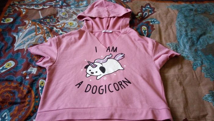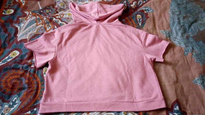 Sweat rose à capuche manches courtes. Taille courte. Devant avec motif. Dos uni. Composition 100% coton. Aucun défaut.