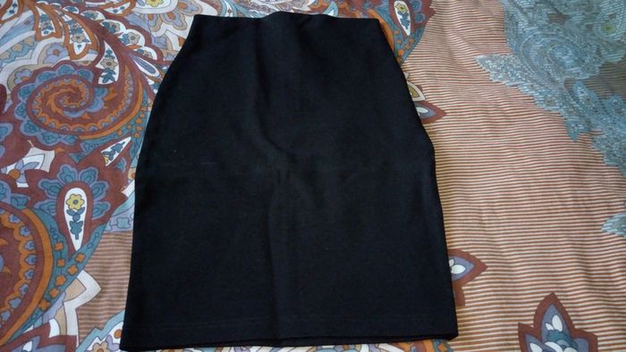 Jupe courte noire. Coupe près du corps. Fermeture par zip à l'arrière. Tour de taille 56 cm. Longueur 48 cm. Très peu portée.