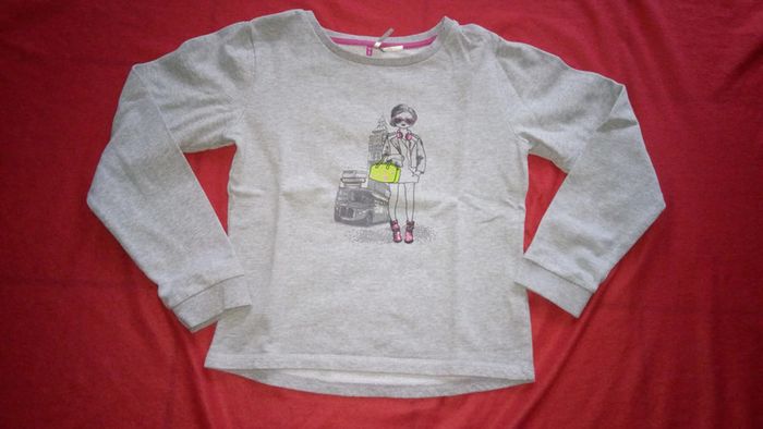 Col rond. Dessin sur le devant, dos uni. Bord des manches avec côtes. Base du pull arrondi. Composition 100% coton.