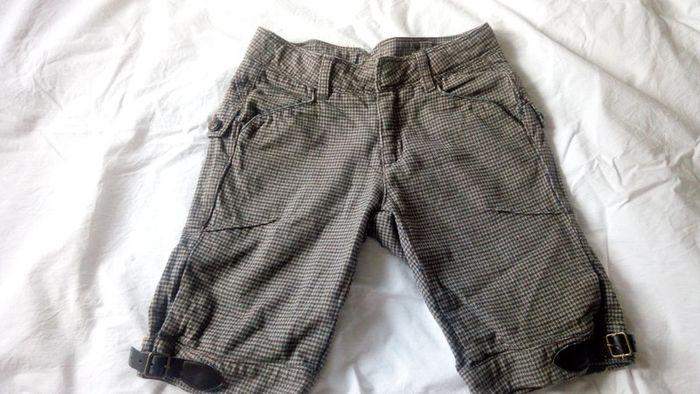 Très joli pantacourt motif pied de poule marron et vert. Boucles réglables au niveau du des jambes. Poches simples devant et double bouton au dos. Fermeture par zip et bouton crochet. Taille ajustable à l'intérieur. Très peu porté. Seul défaut : liseré des poches avant légèrement usé (usure peu visible). Composition 100% coton