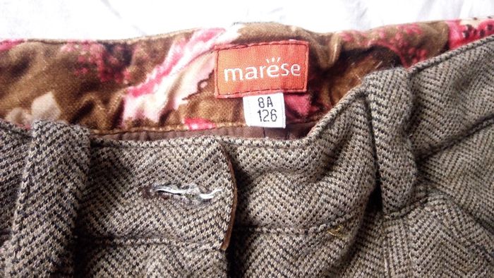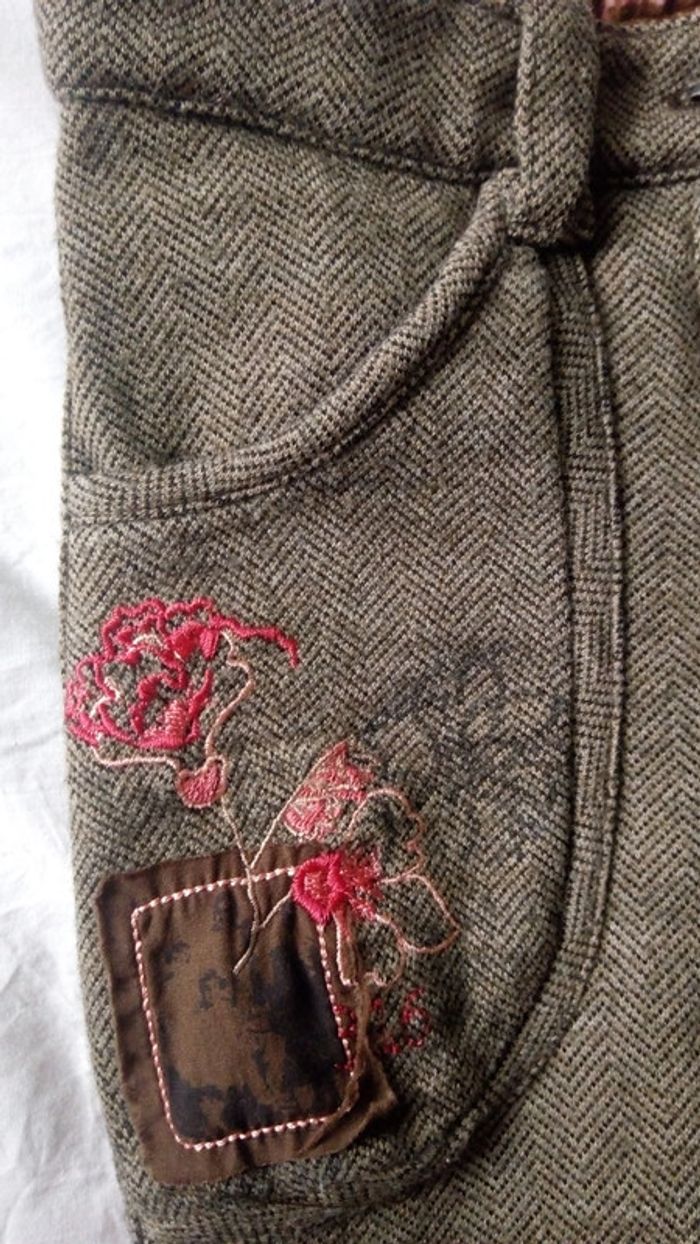 Très joli et chaud pantacourt marron motif zigzag. Broderie sur la poche gauche. Fermeture par zip et bouton classique. Grandes poches sur le devant. Derrière : 1 fausse poche côté gauche et une petite poche zippée côté droit. Taille ajustable à l'intérieur. Doublé à l'intérieur. Vraie patte de boutonnage au niveau du bas des jambes. Composition : 50% acrylique et 50% laine. Très peu porté. Aucun défaut.