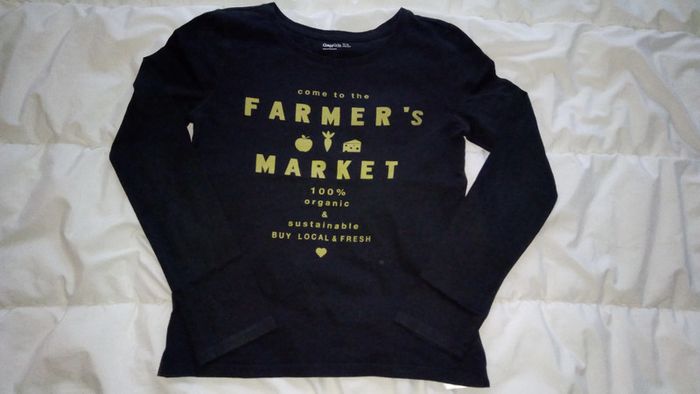 Tee-shirt manches longues noir et jaune. Col rond. Devant imprimé jaune. Dos uni. Composition : 100% coton. Porté 1 fois.