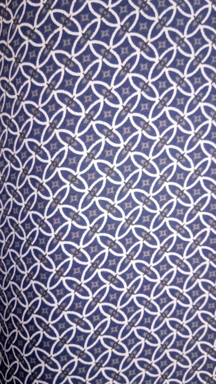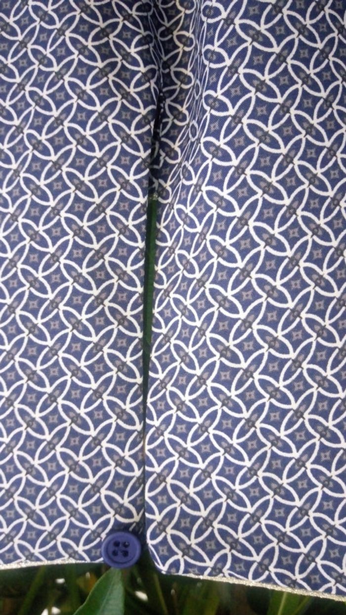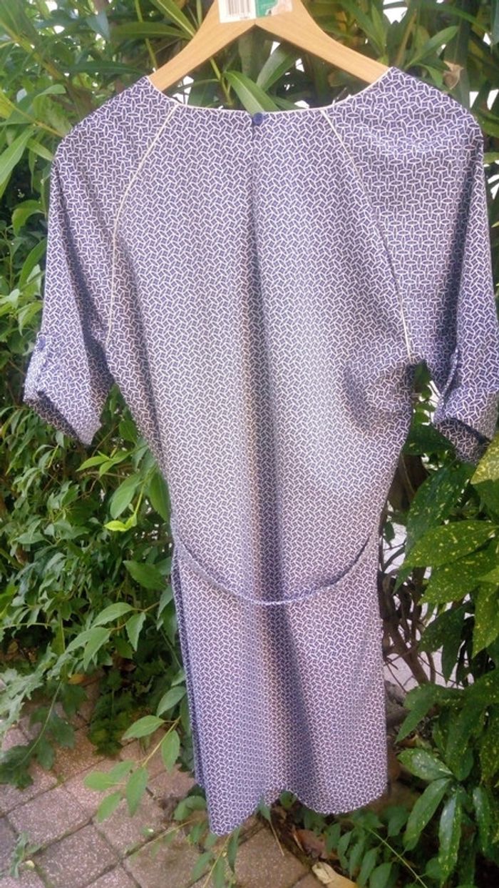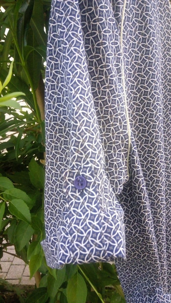Jolie robe bleue d'été à motifs. Matière légère et fluide. Ceinture à la taille. Manches avec revers. Col en V. Bouton au dos. Même motif devant et derrière. Matière 95% viscose, 5% élasthanne. Porté 2 fois. Aucun défaut.