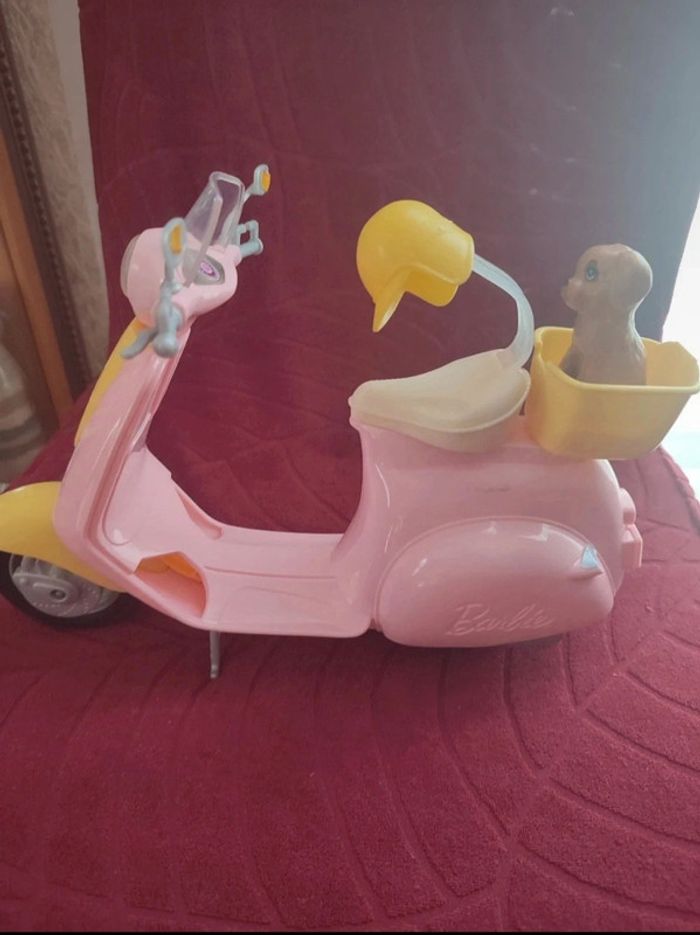 Scooter Vespa Barbie avec son casque et son petit chien dans son panier.