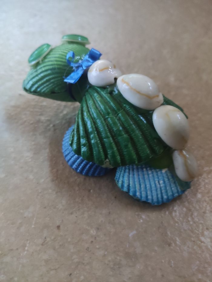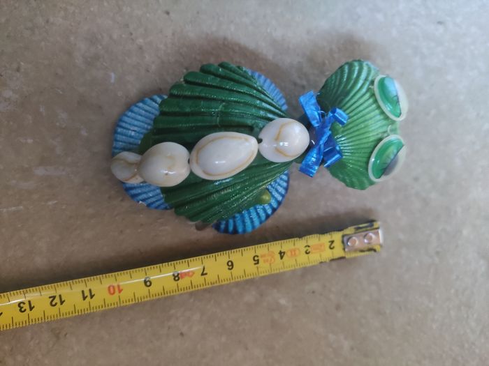 Décoration qui est toujours resté dans son emballage, parfait état. Réalisé avec des coquillages de la Costa dorada en Espagne. Longueur totale 9,5 cm