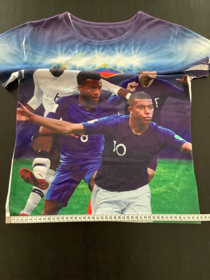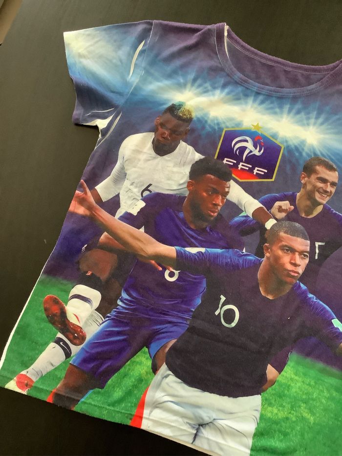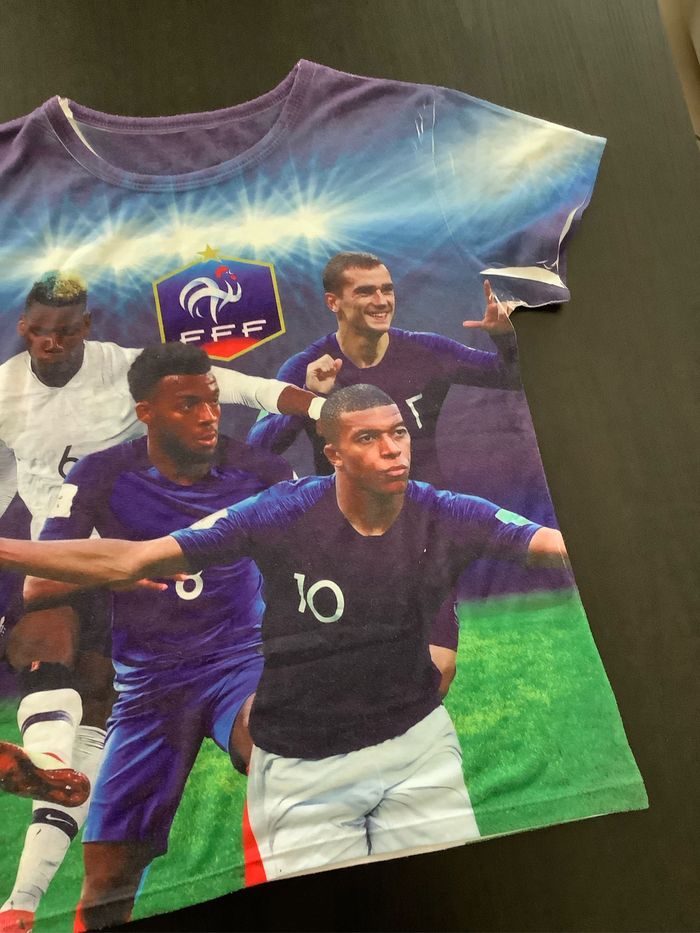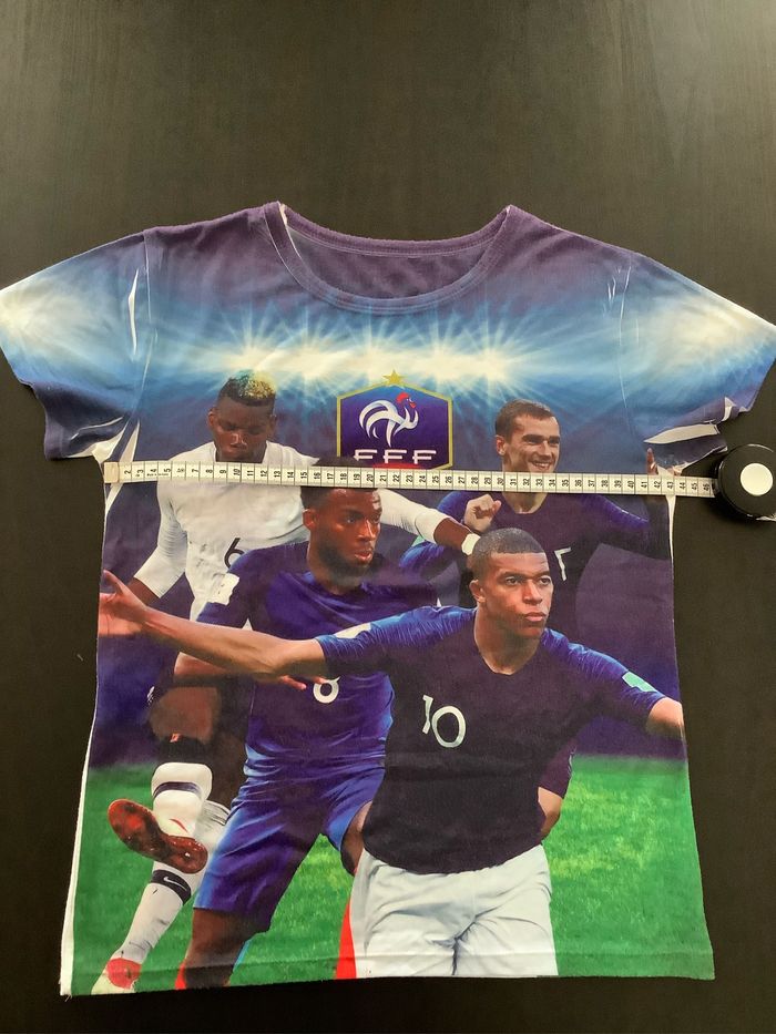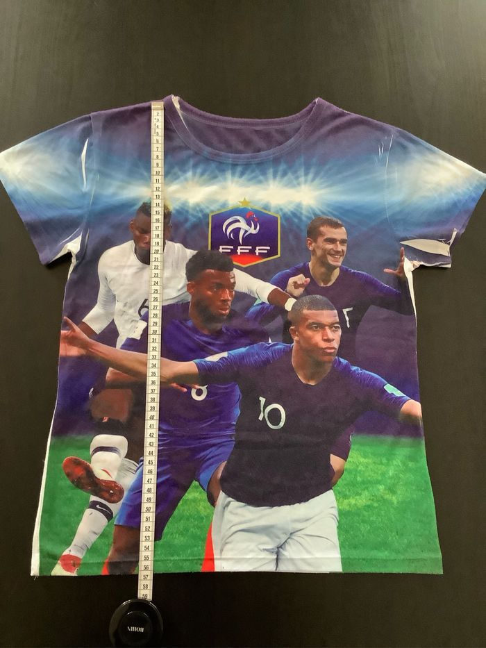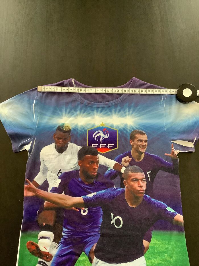 T-shirt avec Griezmann, Mbappé, Pogba et un autre joueur. FFF Taille : Etiqueté 14 ans mais taille un peu petit, plutôt 12 ans (voir mesures sur les photos) Peu porté At51250