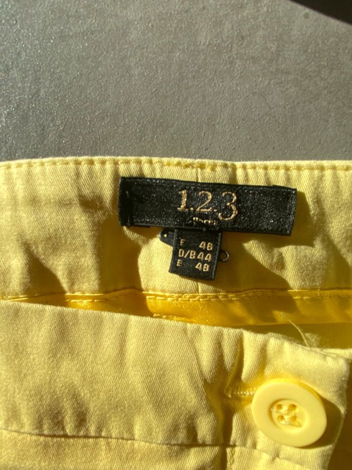 Pantalon jaune, plutôt de couleur claire Jamais porté seulement lavé donc neuf sans étiquette Marque 123 Taille 46