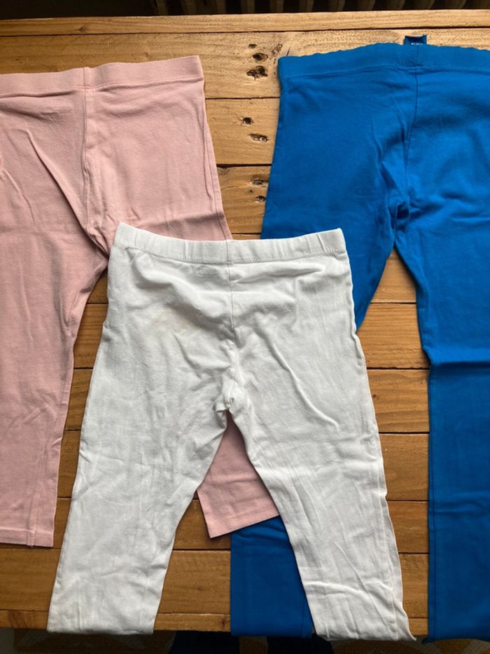 3 leggings 10 ans Rose et blanc mi mollet, bleu aux chevilles Très bon état : le blanc a une petite tâche aux fesses #kryptana_dixans