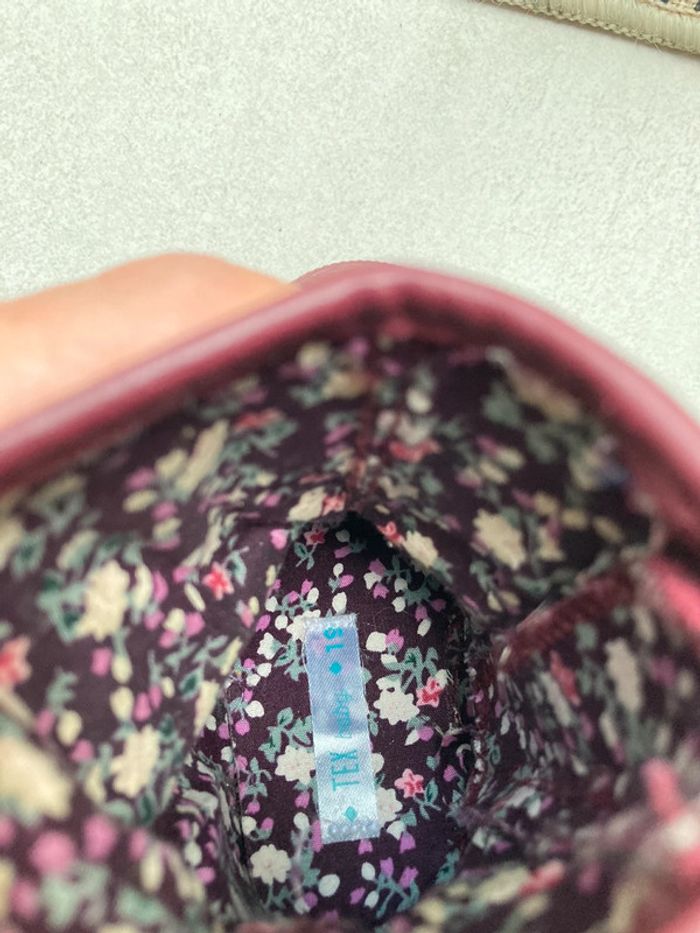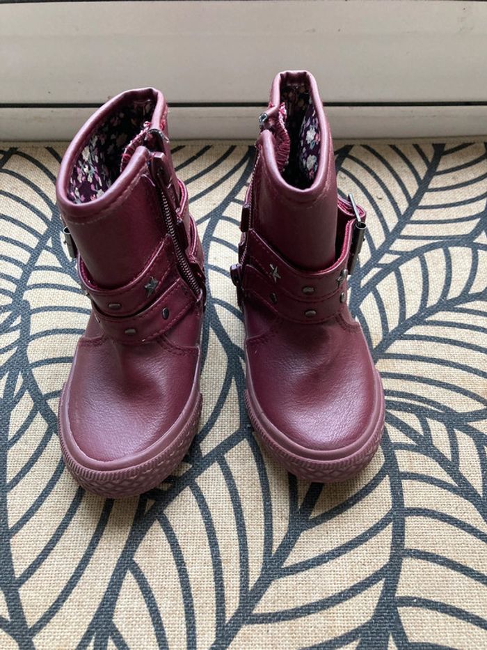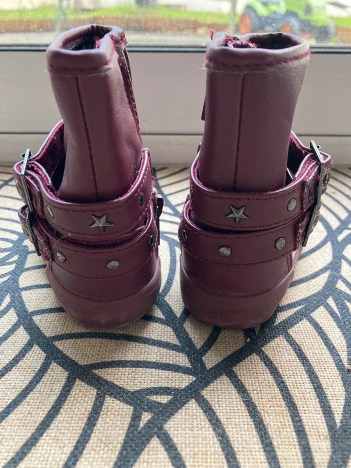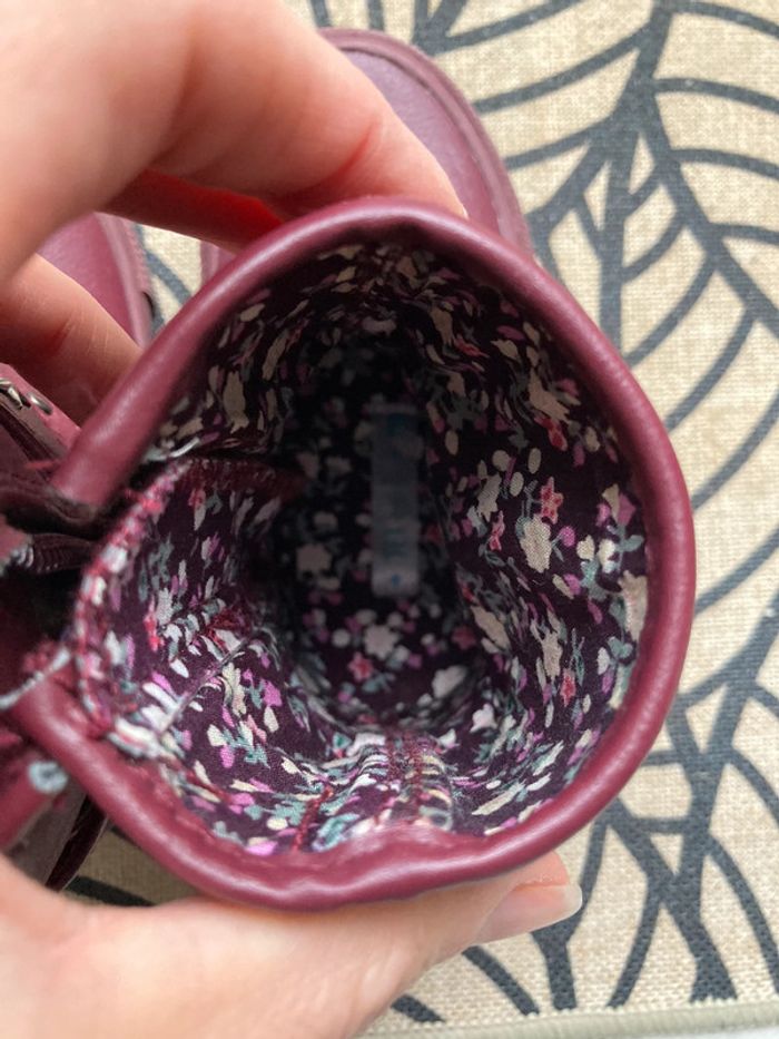 Bottine petite fille Marque Tex baby Taille 19 Couleur Bordeaux prune vin, sangles sur le côté, tissu liberty à l’intérieur Neuves jamais portées #