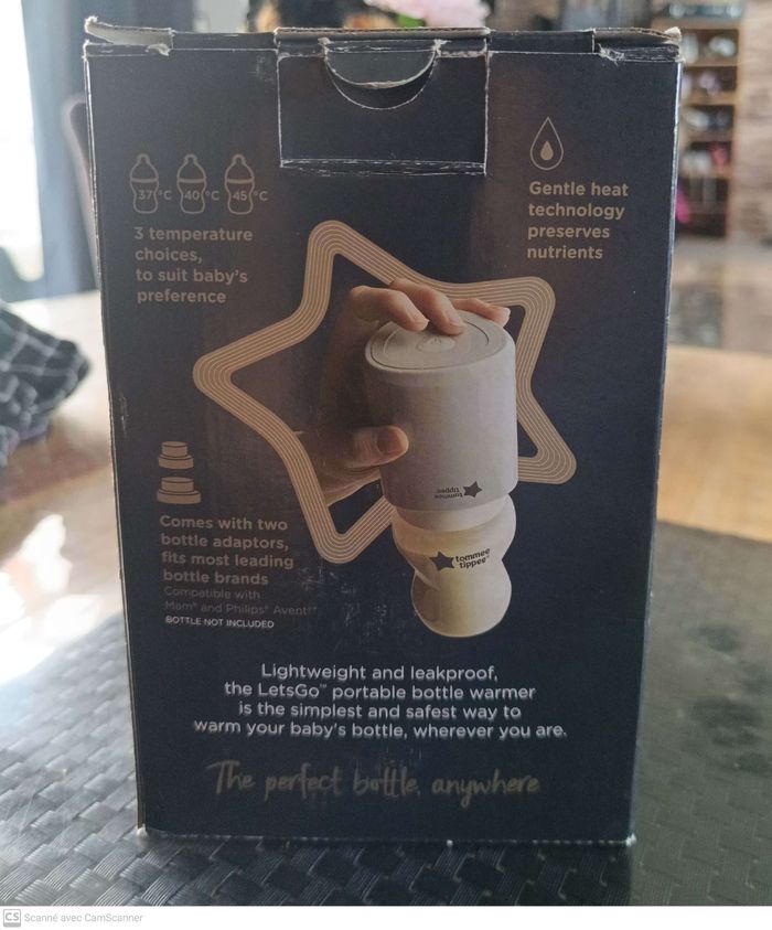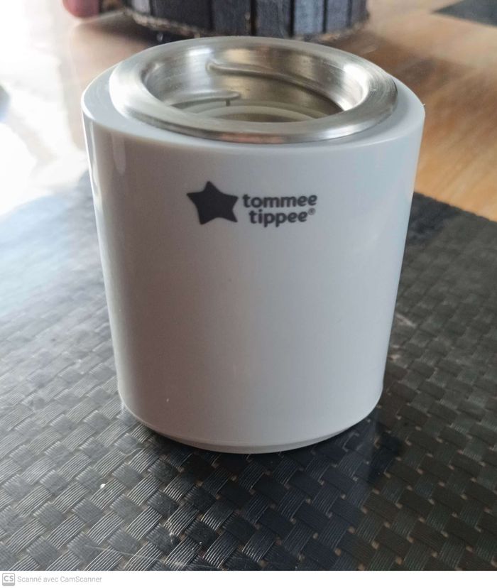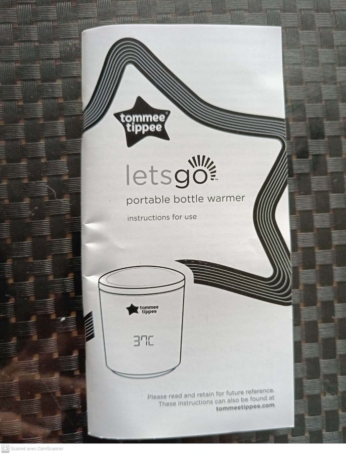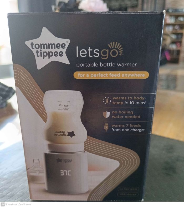 Chauffe biberon portable marque Tommee tippee, à batterie rechargeable sur secteur, idéal pour partir en voyage. vendu dans l'emballage d'origine avec câble de chargement, joint de remplacement en silicone, 2 adaptateurs biberon 1 pour les MAM et un pour les Tommee tippee NEUF