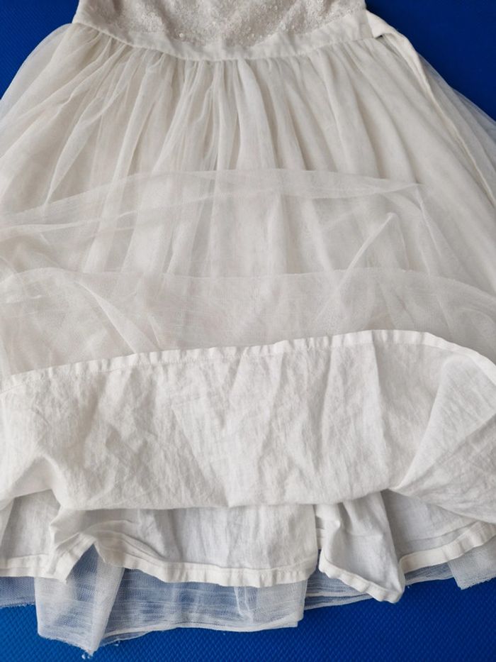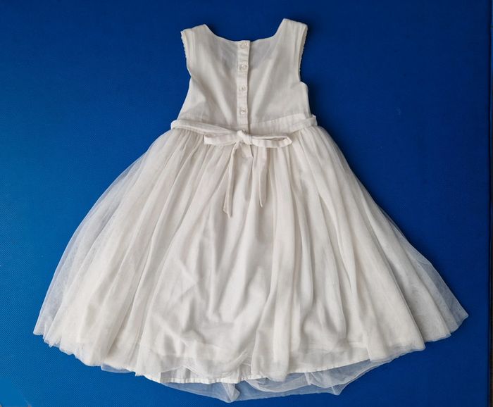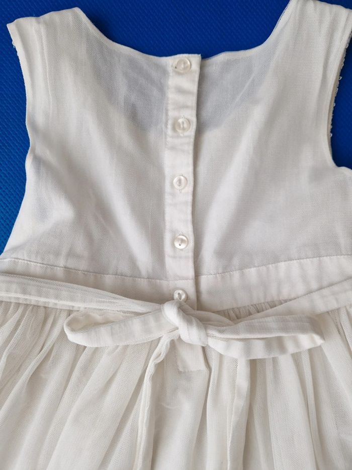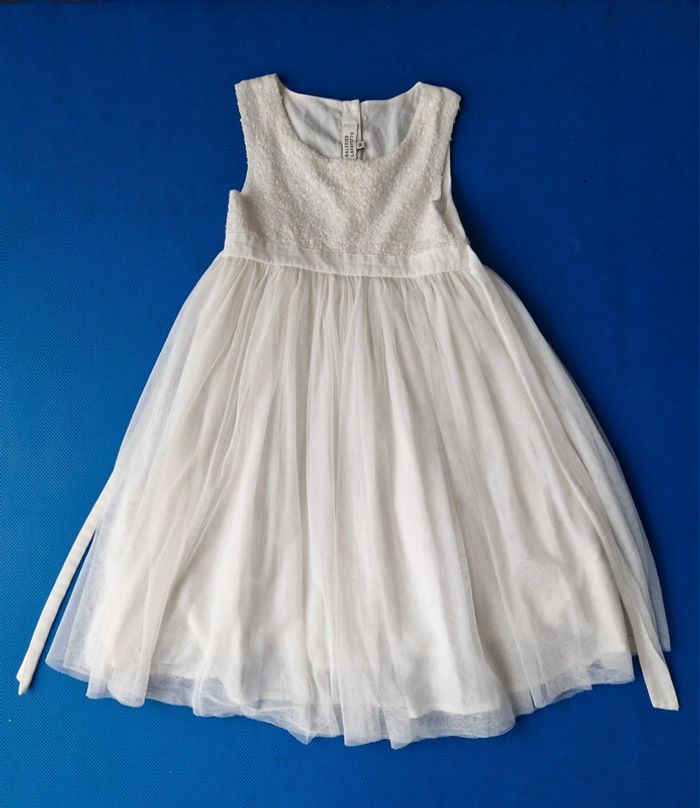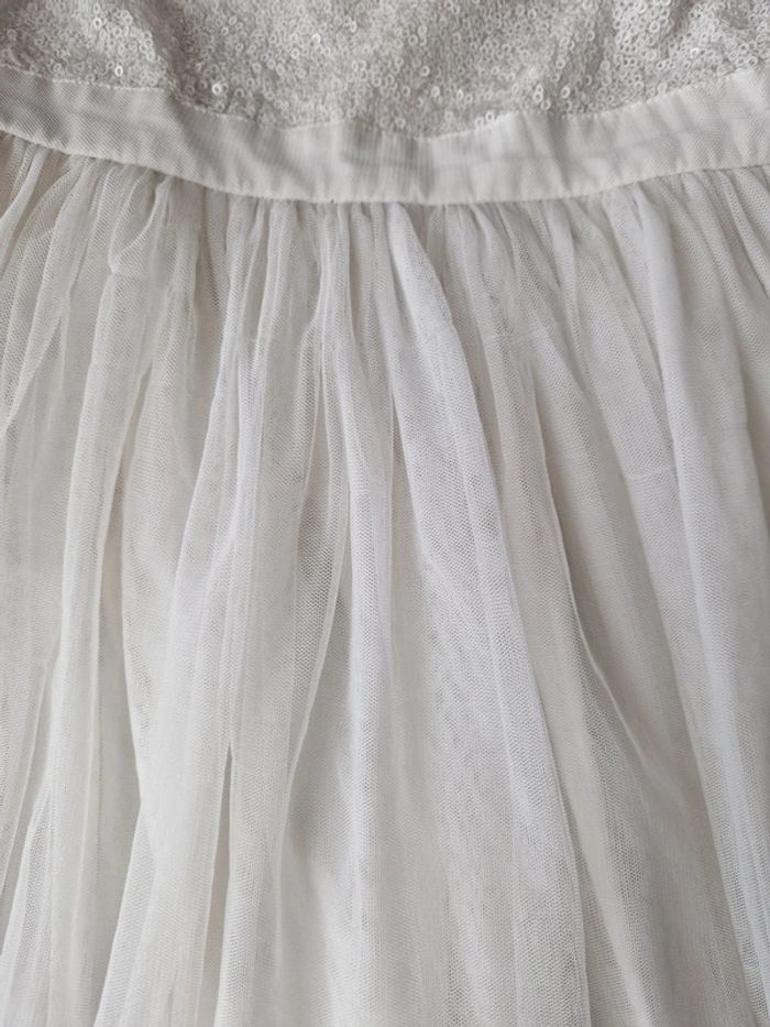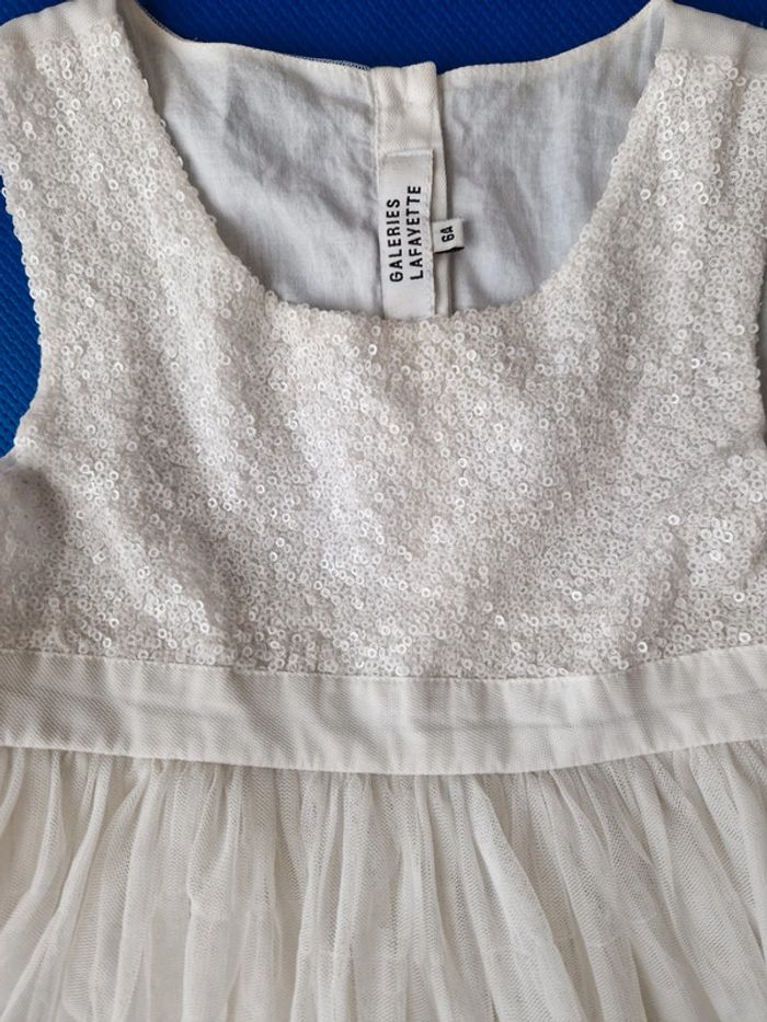 Magnifique robe en tulle et sequins Galeries Lafayette. La robe est d'excellente qualité. Le tulle est très fin et doux. La robe est doublée avec du tissu coton. La robe se noué dans le dos. Boutons dans le dos. Très bon état mais quelques traces d'usure comme un fil tiré. Lavage en machine possible d'après l'étiquette mais toujours lavée à la main. La robe sera à laver et comporte quelques traces de goûtés chocolatés! Tout le reste de mon dressing et propre mais je vous laisse le soin du nettoyage pour cette jolie pièce. Idéale pour shooting photo, Noël, nouvel an, mariage, baptême, déguisement de princesse ou autre soirée.