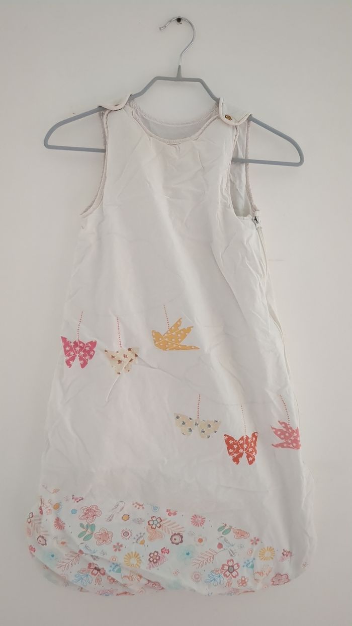 Gigoteuse avec des motifs d'oiseaux et papillons Elle montre des signes d'usure au niveau du col. Idéale en hiver et à la mi-saison.
