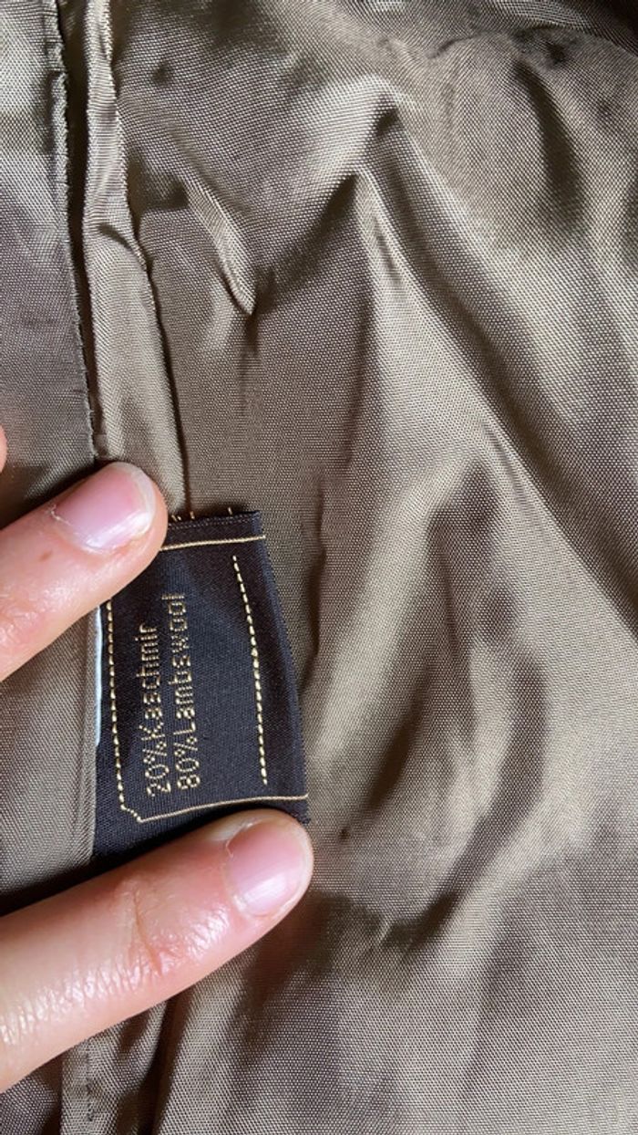 Magnifique veste camel en cachemire et laine d’agneau Avec deux boutons dorés Comme neuve, peu portée La taille correspond à un 40/42 environ Micro défauts tout en bas de la veste, ne se voient pas