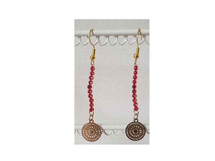 Boucles d’oreilles. Boucles d’oreilles en perles de rocaille rouge avec breloque en dentelle dorée. Longueur totale : 6,4 cm Longueur hors crochet : 4,4 cm Diamètre de la breloque : 1,2 cm En très bon état. Fait main. 2€. #vero38110bijoux