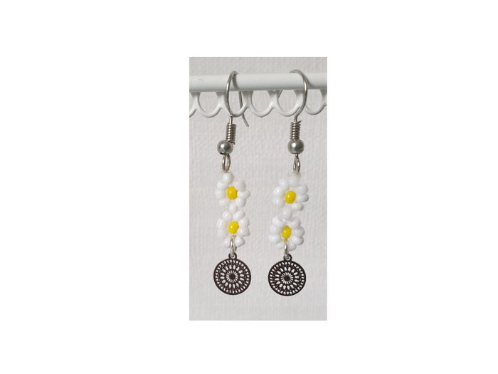 Boucles d’oreilles. Boucles d’oreilles en perles de rocaille blanches et jaune avec breloque en acier argenté style dentelle. Longueur totale : 4,3 cm Longueur hors crochet : 2,4 cm Diamètre de la breloque : 0,8 cm En très bon état. Fait main. 2€. #vero38110bijoux