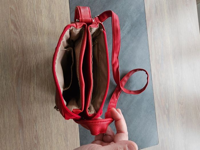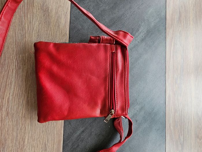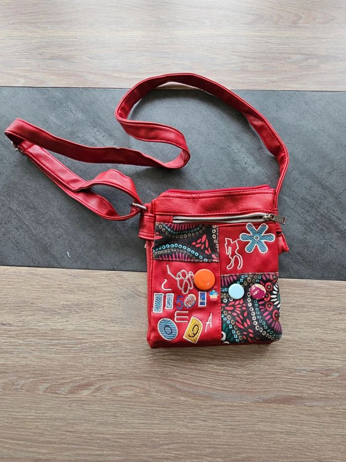 Vends sacoche bandoulière avec 1 poche zippée devant et une derriere. Une poche centrale zippée également avec d'autres poches à l'intérieur. Peinture sur le "bouton" de devant qui est partie