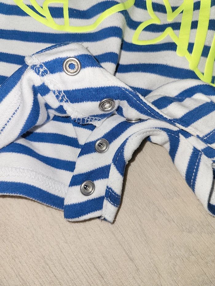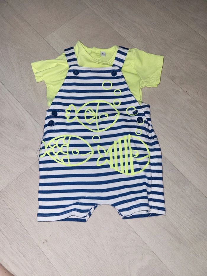 Salopette rayée bleu et blanc, motifs poissons jaunes fluo avec tee-shirt assorti jaune fluo. TBE. Couleurs estivales. Taille 9 mois. N'hésitez pas à visiter mon dressing, remises sur lots activées. #nd8015bébé #salopette9mois