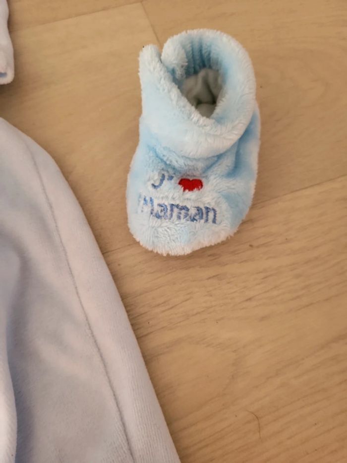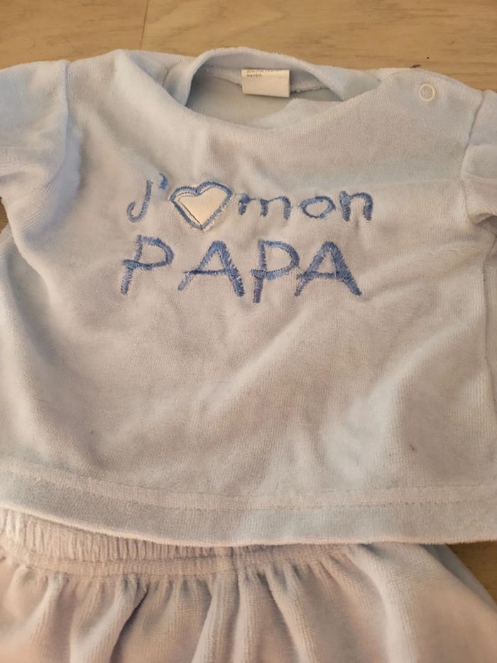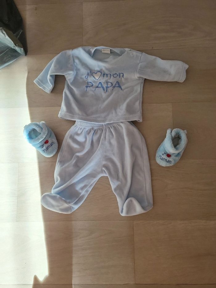 Pyjama 2 pièces j'aime mon papa + chaussons j'aime maman Excellent état. Taille 3 mois. #nd8015bébé N'hésitez pas à visiter mon dressing, remises sur lots activées.
