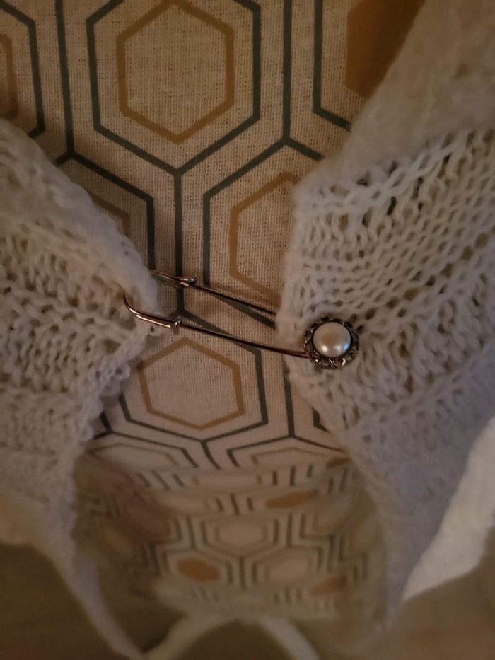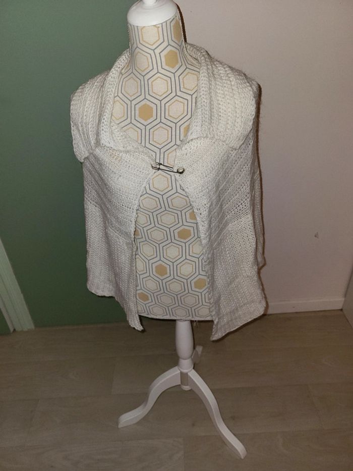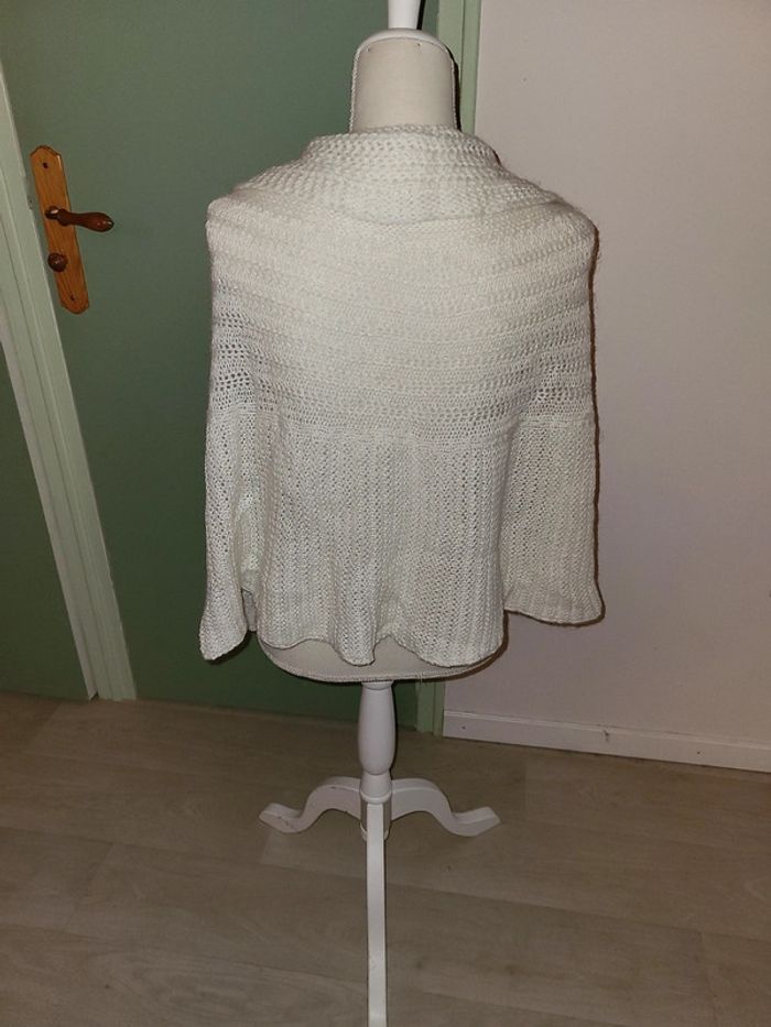 Magnifique. Acheté pour mariage mais non porté car utilisation d'une étole. Laine fine ajourée. Fermeture par broche argentée avec perle. Idéal Mariage mi saison.
