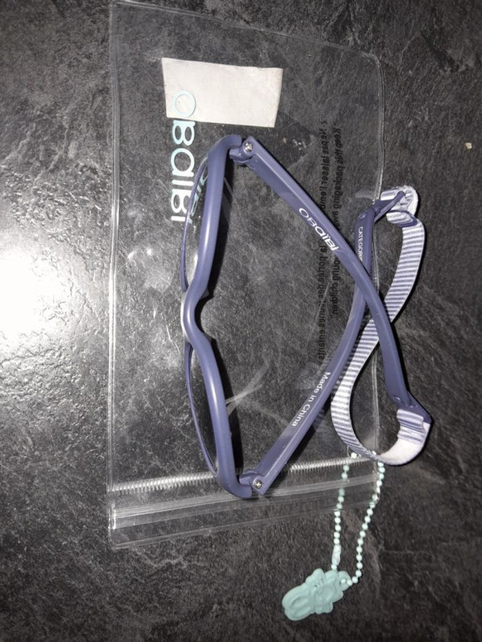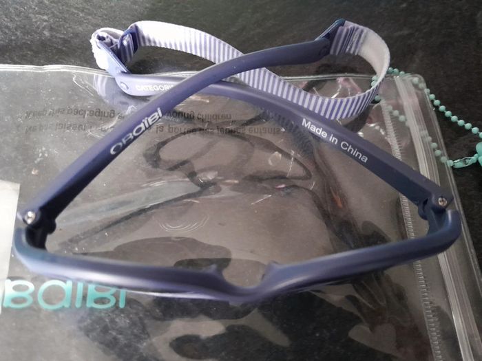 Monture légère Protection UV catégorie 4 Elastique réglable maintenu sur chaque branche Largeur de la monture 9,5 cm environ vendues dans un étui en plastique transparent zippé. Micro rayures sur les carreaux Coloris bleu violet
