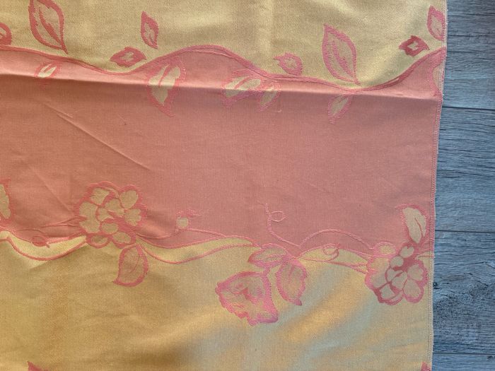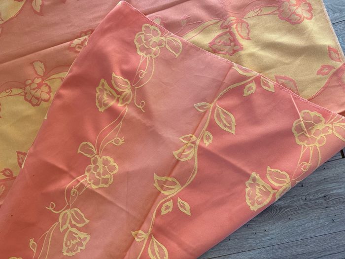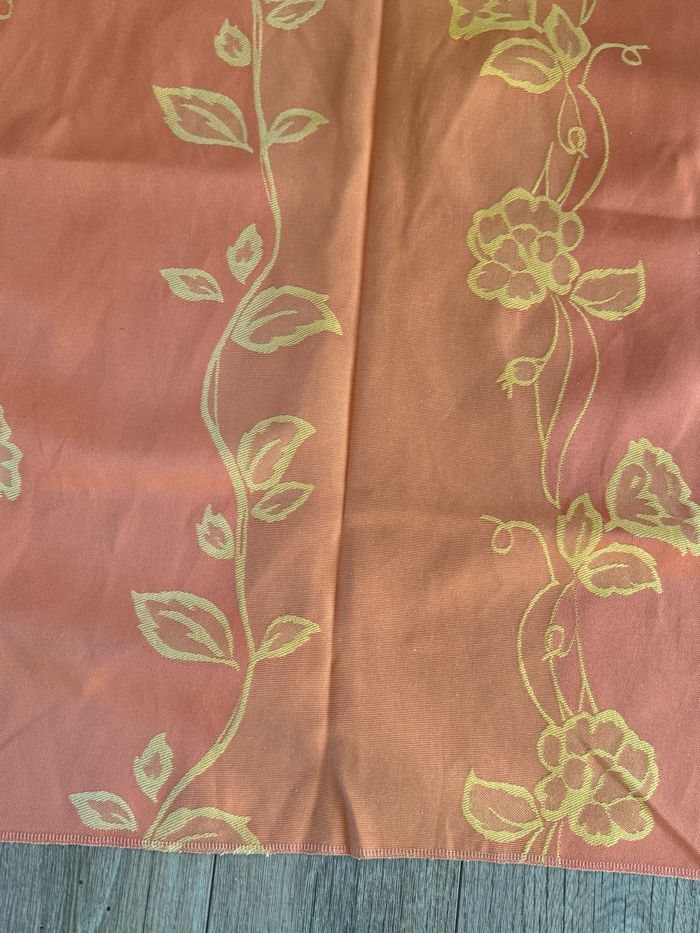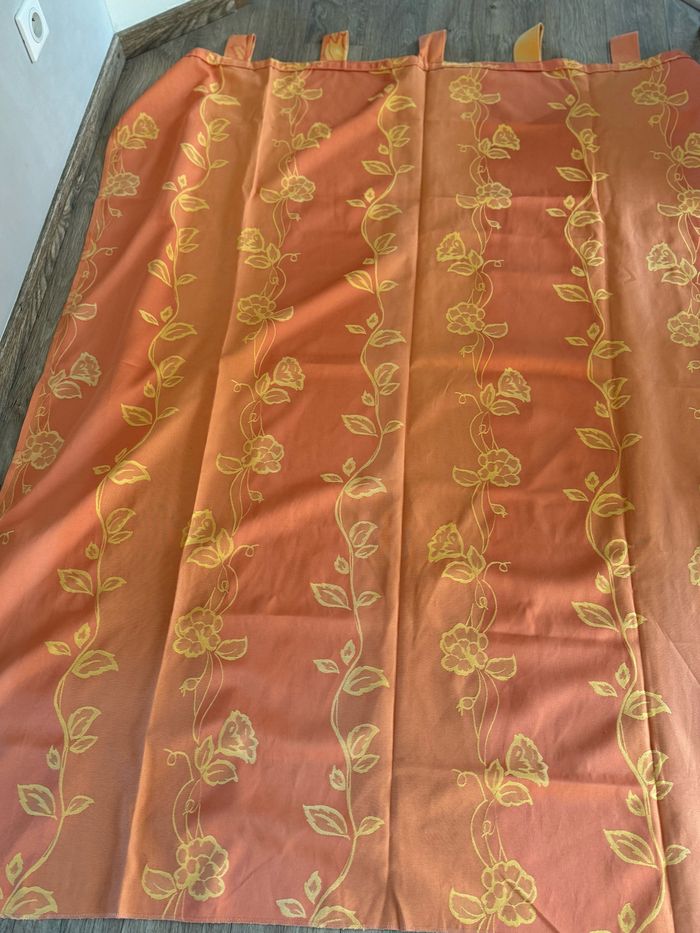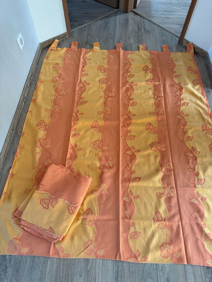 Paire rideaux opaques à pattes en tissu Toile épaisse à rayures oranges et motifs fleurs Dimensions de chaque rideau : - largeur 134 cm - hauteur 187 cm BU