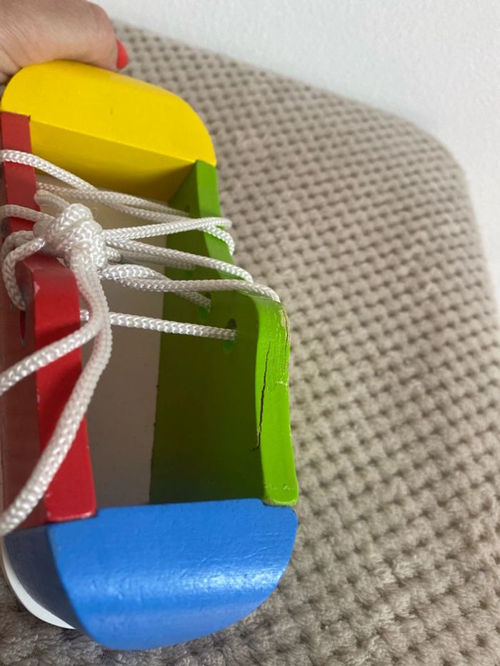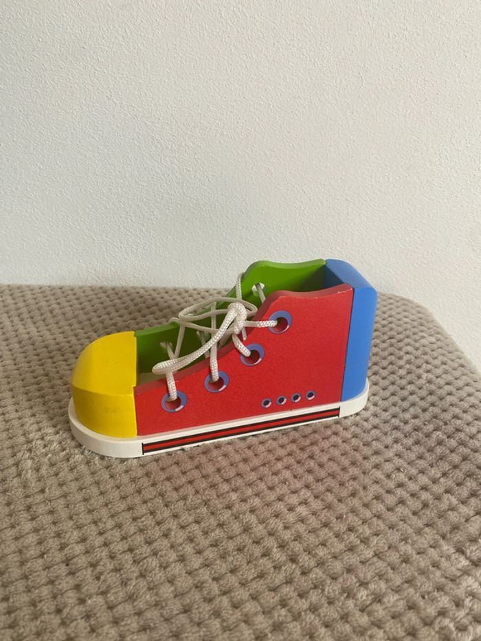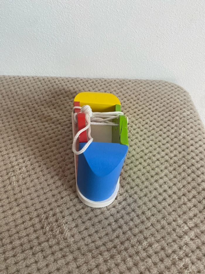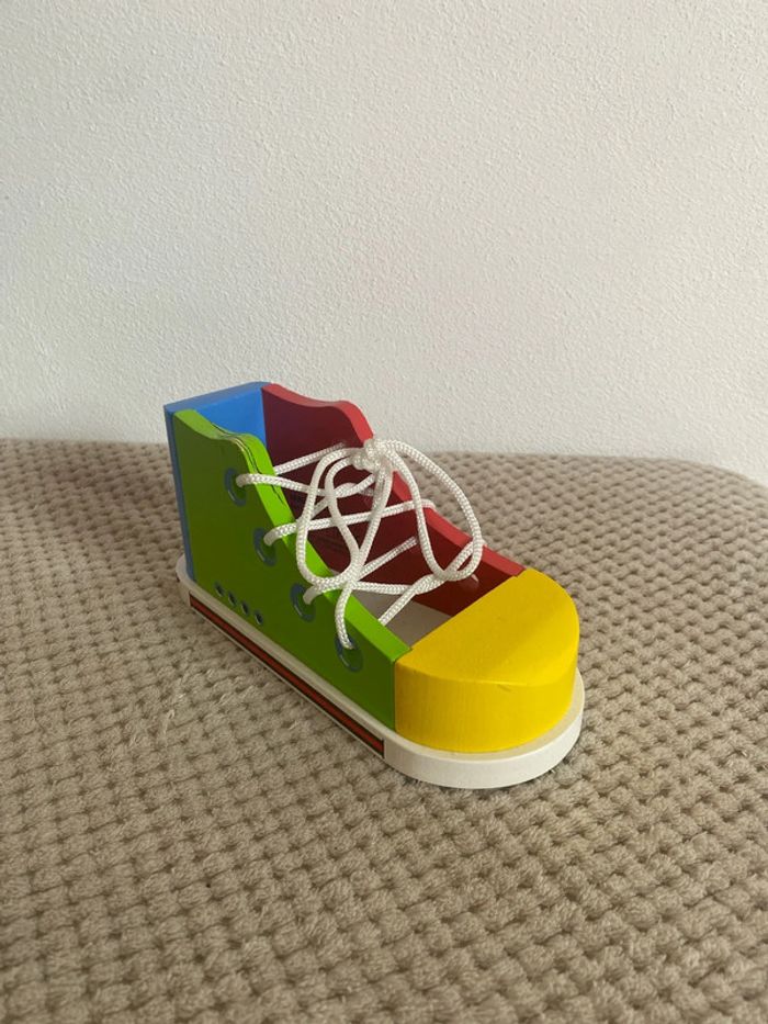 Apprendre à son enfant, à lacer ses chaussures, avec cette chaussure en bois et son petit cordon La partie verte est un peu abîmée, voir les photos, ça n’empêche en rien l’utilisation