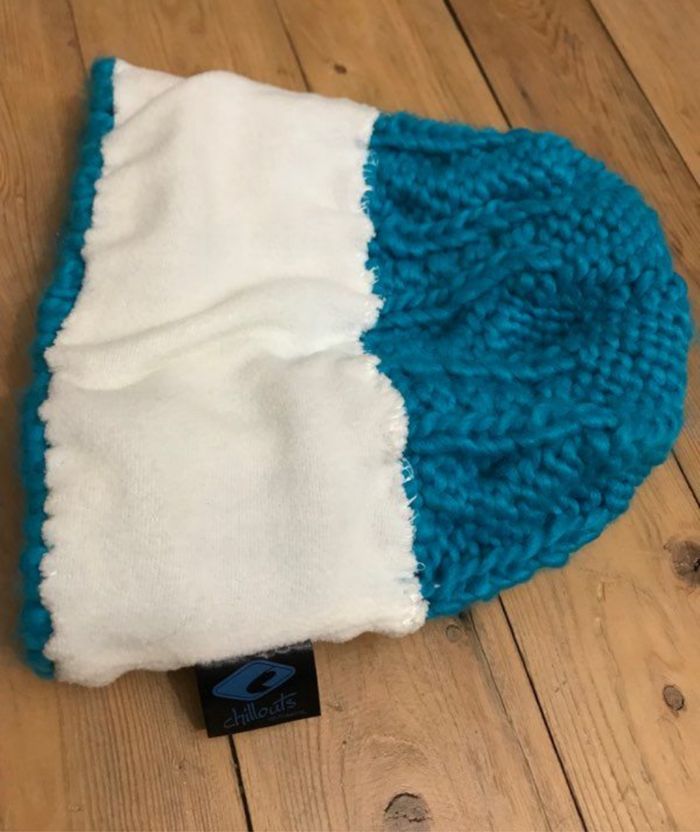 Joli bonnet bleu turquoise torsadé 100% acrylique Bande polaire sur l’intérieur taille unique , convient autant pour enfants que pour adultes, mesure à plat de 23 à 30 cm en tirant Marque Chillouts , très peu servi, une semaine au sport d’hiver