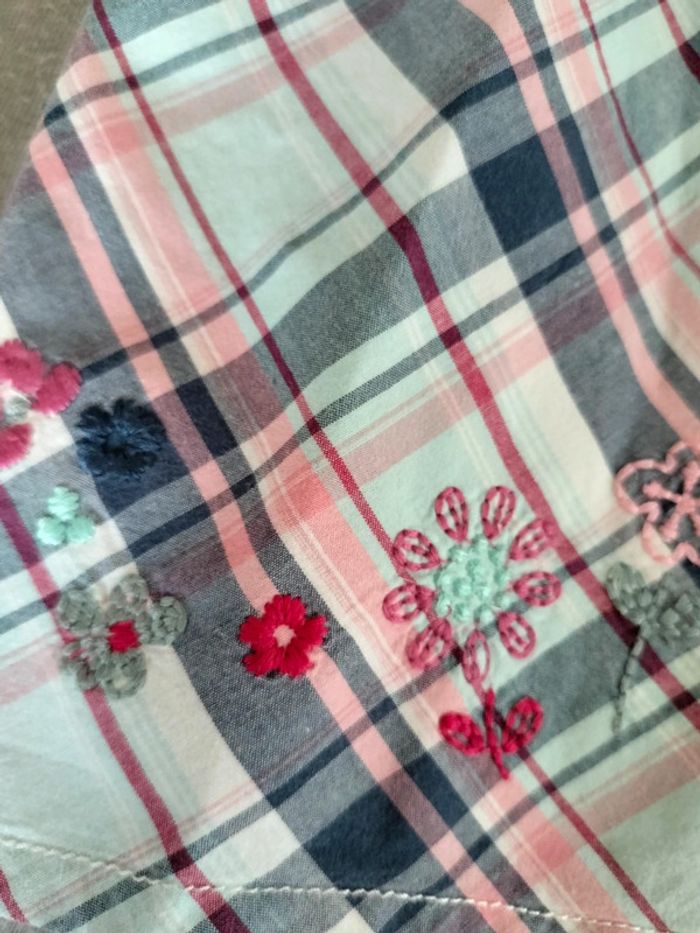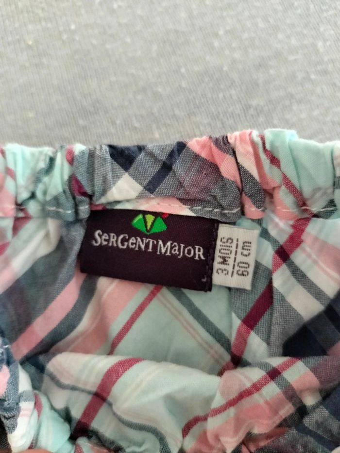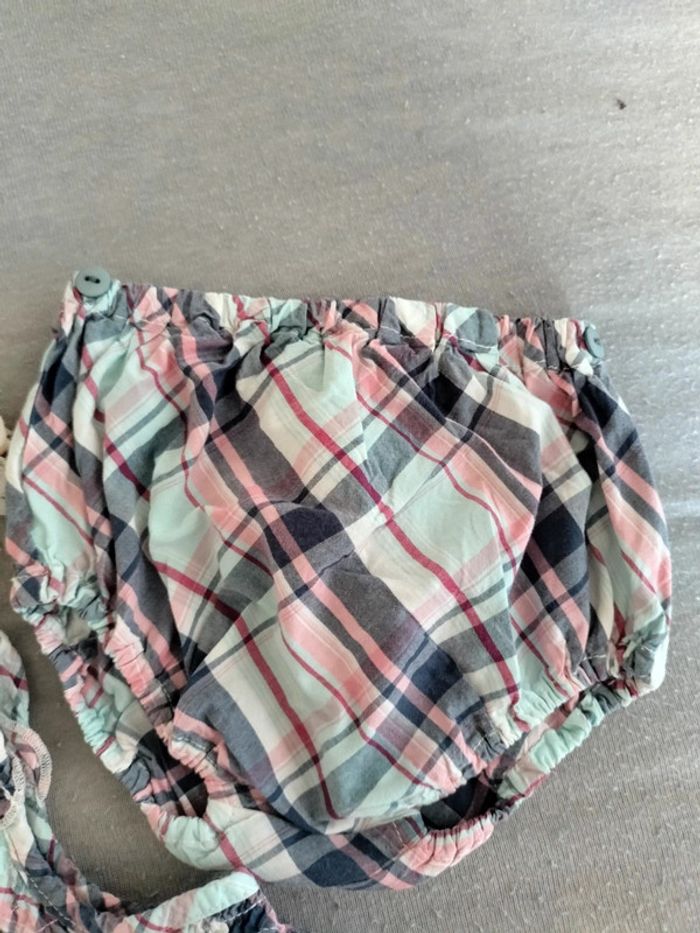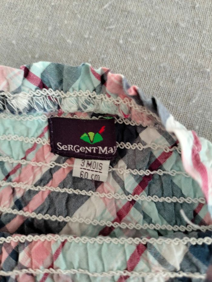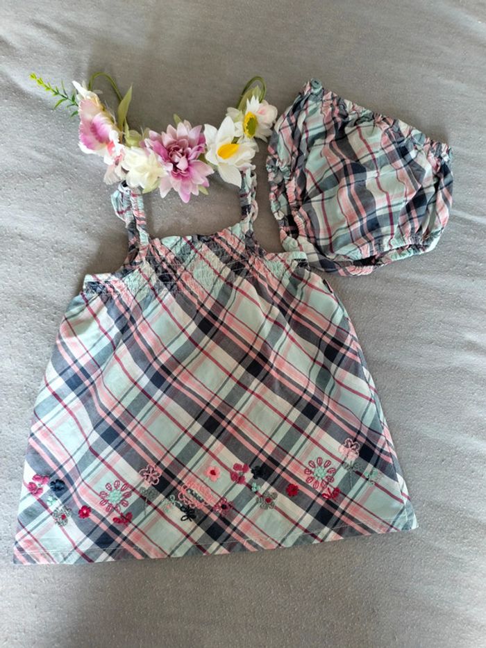 Robe d'été à brides fines à carreaux rose et bleu avec broderies en bas de la robe. En coton. Marque Sergent Major, taille 3 mois. Aucun défaut.
