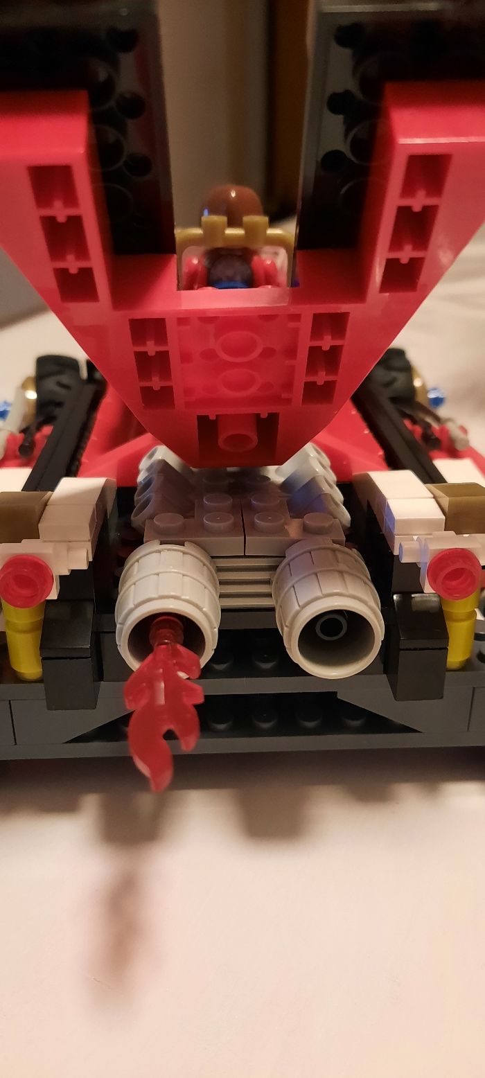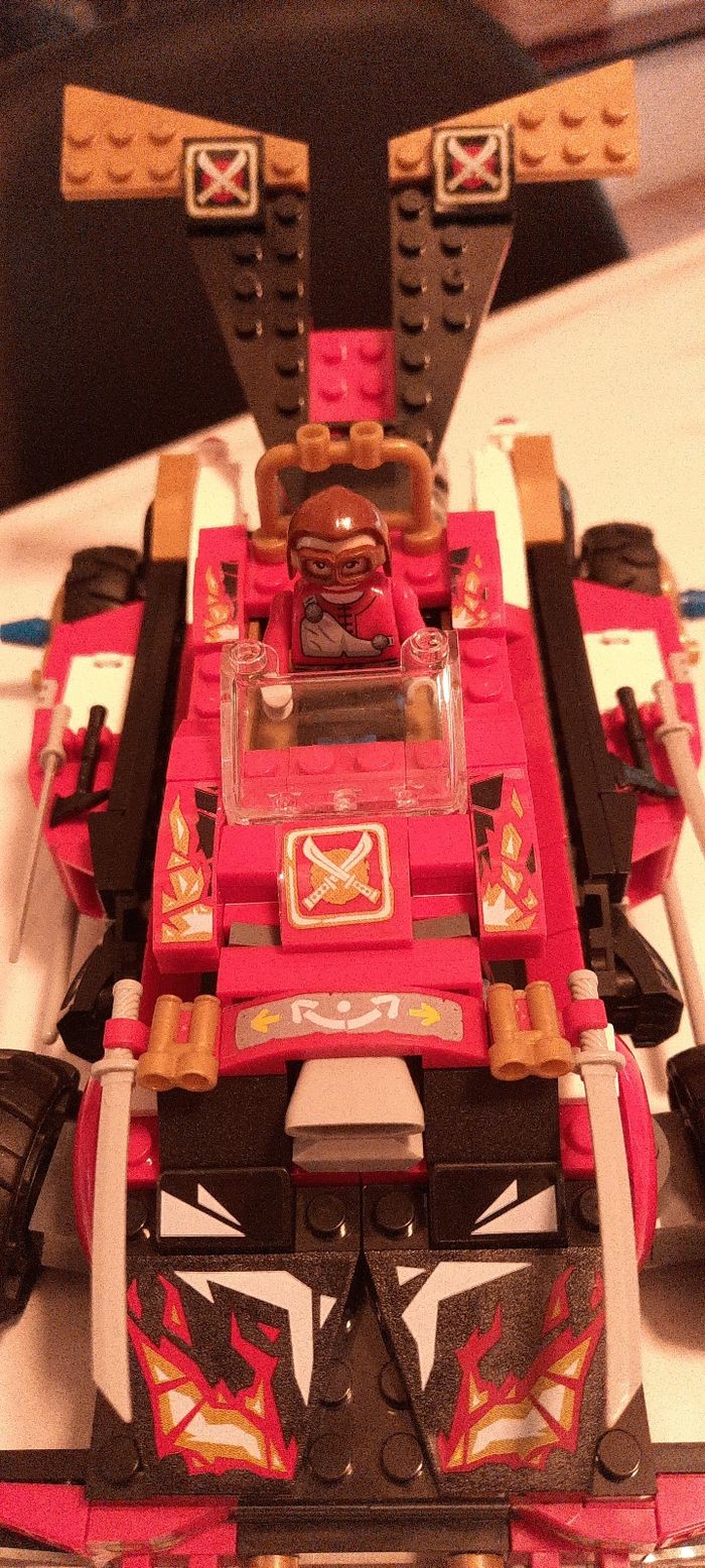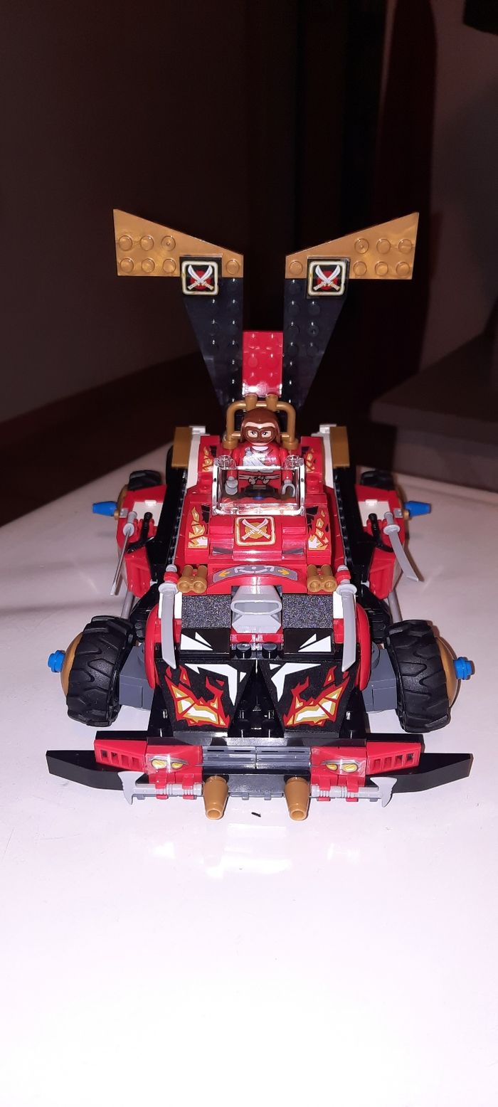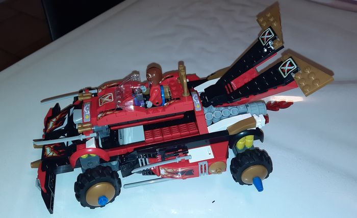 En très bon état. Véhicule fantastique avec direction mécanique du cockpit (si on le penche à droite les roues tourne à droite...). Complet sauf une flamme à l'arrière du véhicule (voir photo). Jeu compatible avec tous les blocs de construction standards.