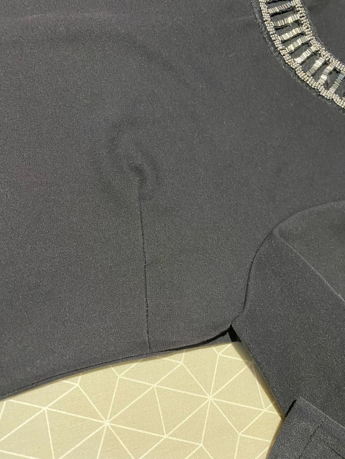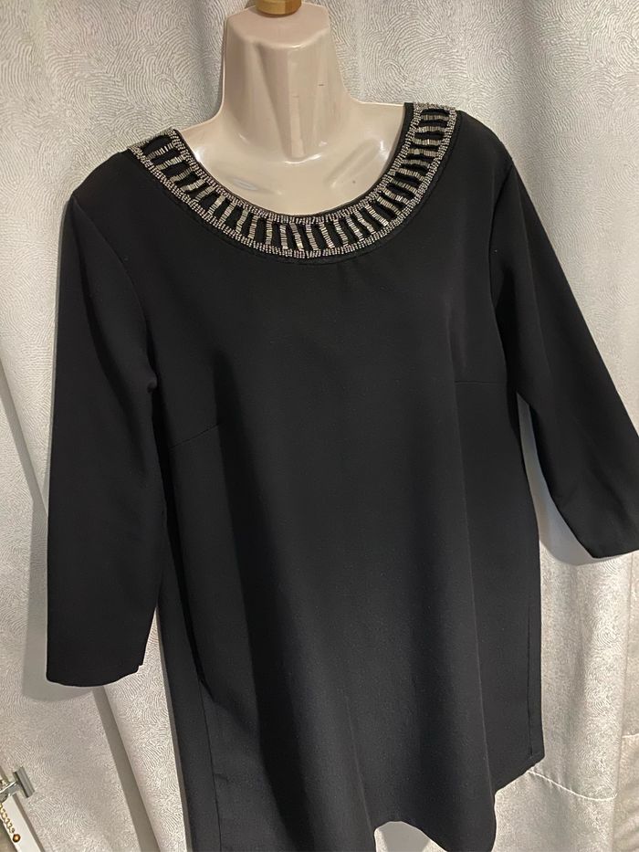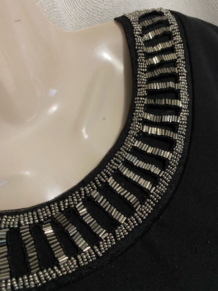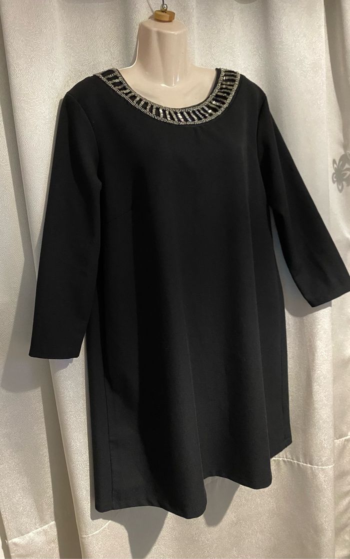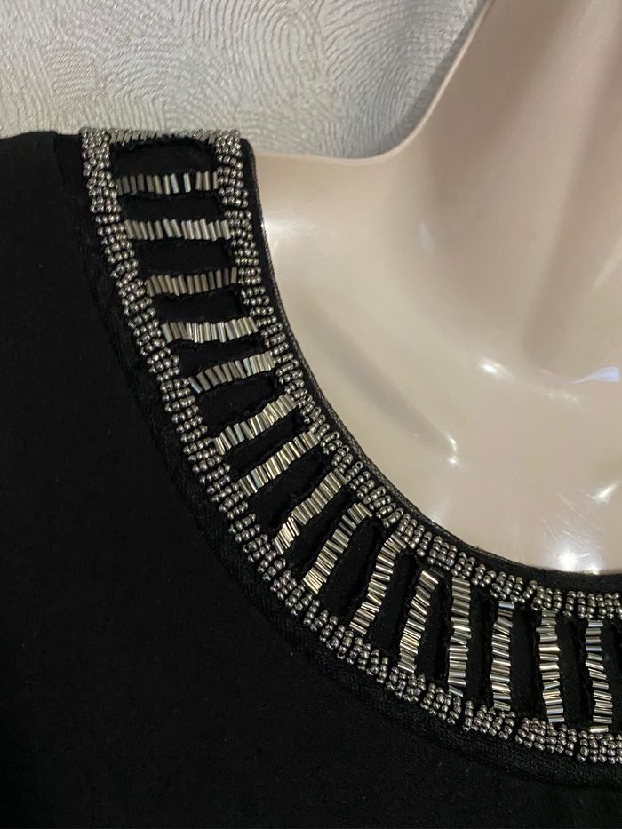 Magnifique robe noire perles sur l’encolure taille 4 modèle déposé Manches 3/4 Entièrement doublé 95% polyester 5% elasthane Fabrication française Carrure 43 cm Aisselle à aisselle 57 cm Longueur dessous de manche 36,8 cm Longueur devant 94,5 cm ( un peu plus courte derrière 89,5 cm )