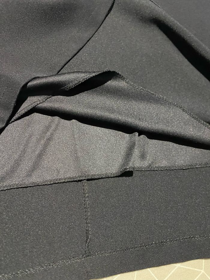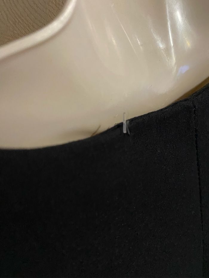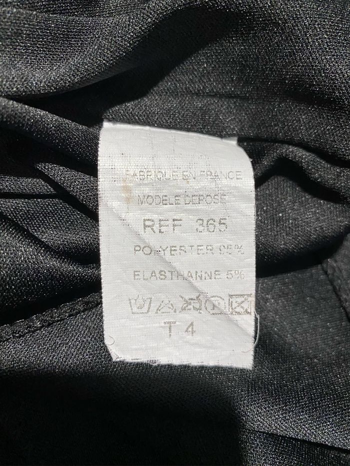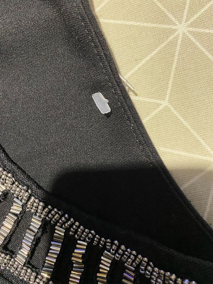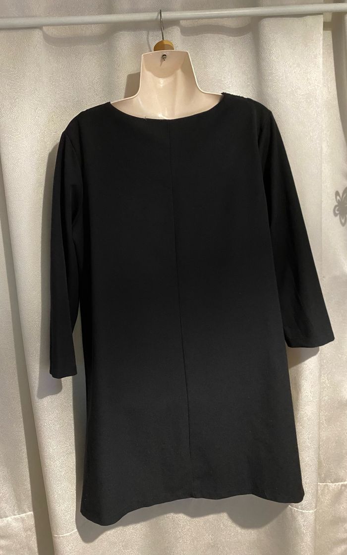 Magnifique robe noire perles sur l’encolure taille 4 modèle déposé Manches 3/4 Entièrement doublé 95% polyester 5% elasthane Fabrication française Carrure 43 cm Aisselle à aisselle 57 cm Longueur dessous de manche 36,8 cm Longueur devant 94,5 cm ( un peu plus courte derrière 89,5 cm )