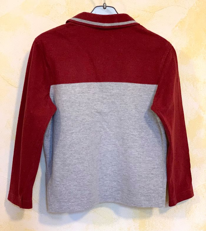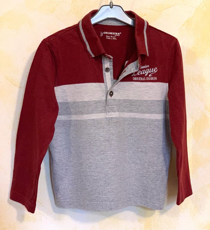 Polo manches longues Orchestra 5 ans 110 cm Col de polo 97 % coton, 2% polyester, manches longues, couleur bordeaux et gris. Ouverture 3 boutons. Brodé sur la poitrine. #Orchestra #polo #bordeaux #pologarçon #mancheslongues #5ans #cc_garcon5ans