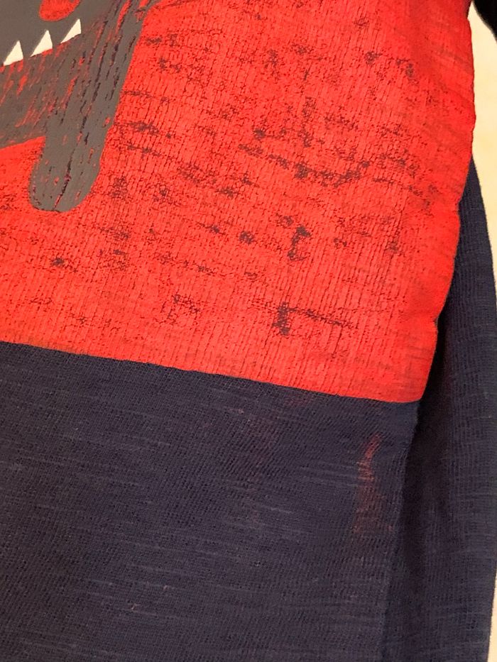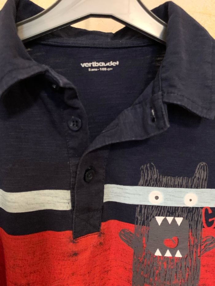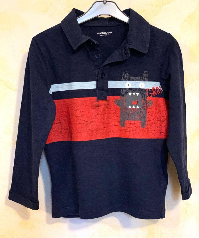 Polo bleu manches longues Vertbaudet 5 ans/108cm 100 % coton, manches longues bleu, impression sur le devant petit monstre gris (la frange rouge a un effet effacé). Étiquette pour le prénom * tache rouge décolorée sur un côté gauche. #Vertbaudet #polo #bleu #pologarçon #mancheslongues #5ans #cc_garcon5ans