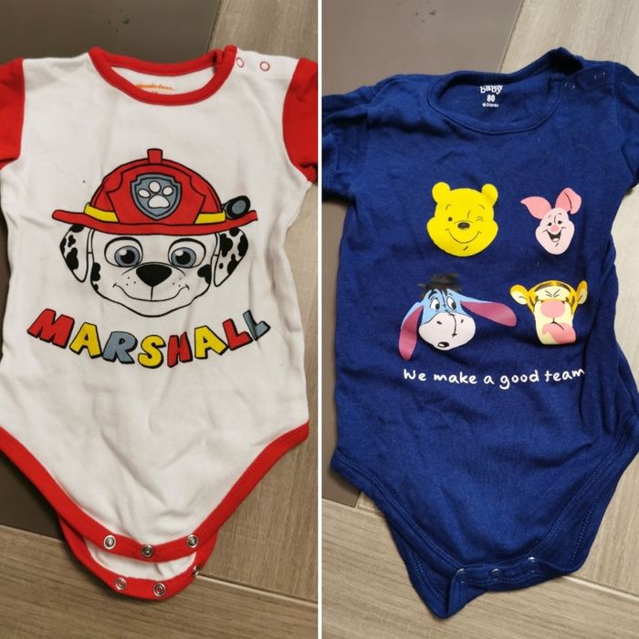 Vends lot de 2 bodys manches courtes, taille 12 mois, en très bon état, très peu porté car pas la bonne saison. Le premier c'est Marcus de la pat'patrouille et le second c'est Winnie l'ourson