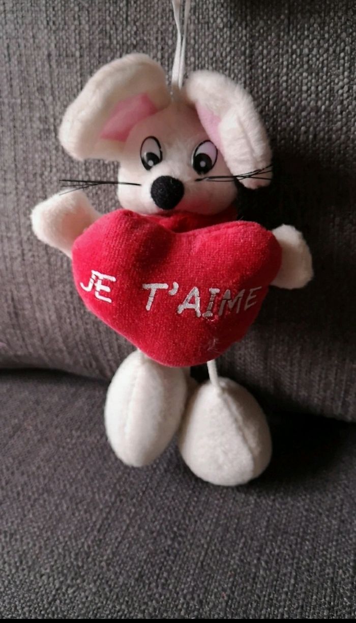 Peluche souris Tient un petit coeur dans ses mains marqué je t'aime. Possibilité de l'attaché en haut Marque eluz