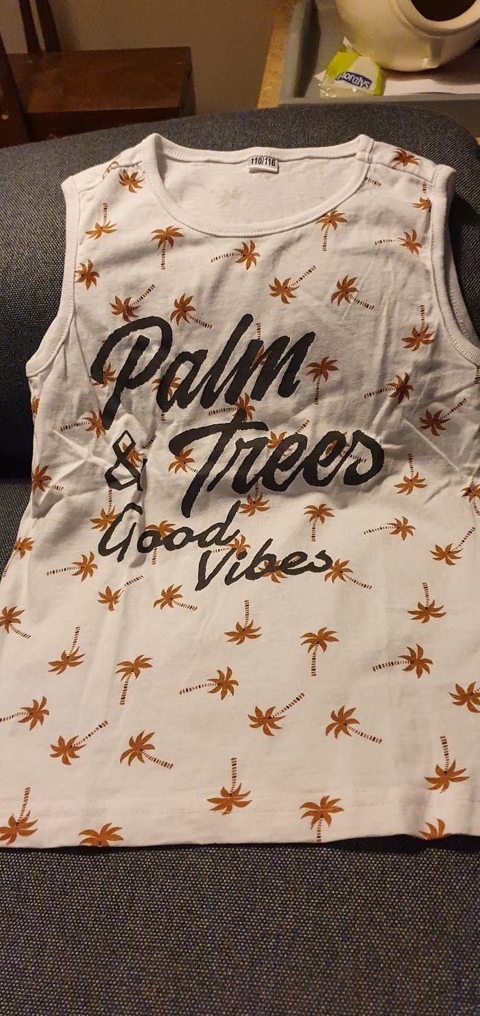 Tee-shirt forme marcel garçon 👦 Taille 5 ans 110-116 cm Couleur blanc avec dessins et une inscription en noir Marque Zeeman Maison non fumeur Linge lavé avec lessive bébé