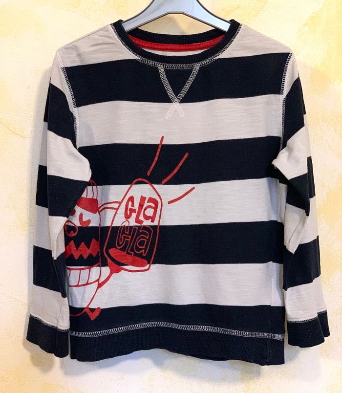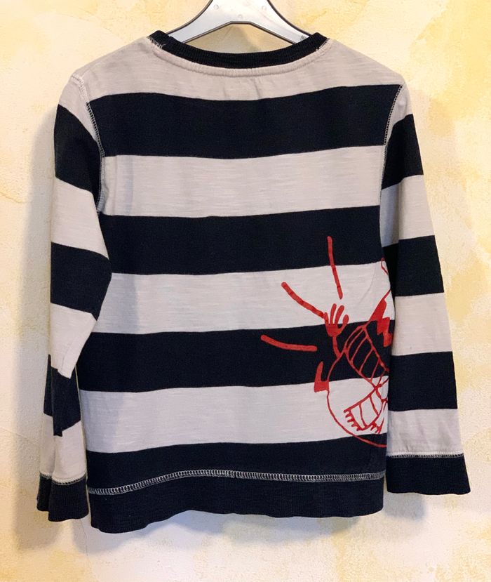 T-shirt à rayures manches longues Vertbaudet 5 ans/108 cm 100 % coton, manches longues, gris lignes bleu foncés, impression personnage sur le côté #Vertbaudet #bleu #tshirtgarçon #mancheslongues #5ans #cc_garcon5ans