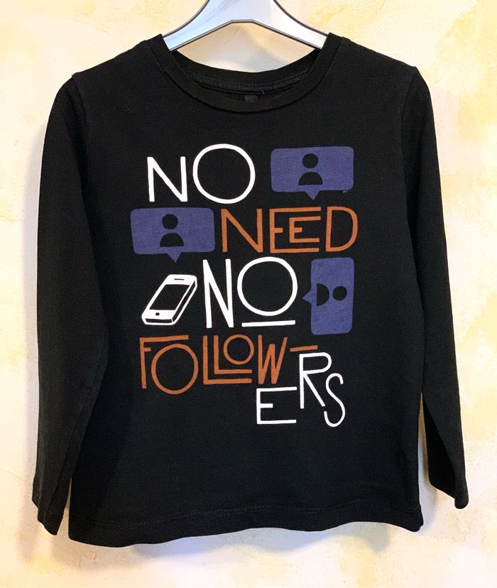 T-shirt noir manches longues - 5 ans 100 % coton, manches longues, noir, impression sur le devant « no need no followers » *petite retouche sur la manche droite, voir dernière photo #tshirtgarçon #noir #mancheslongues #5ans #cc_garcon5ans