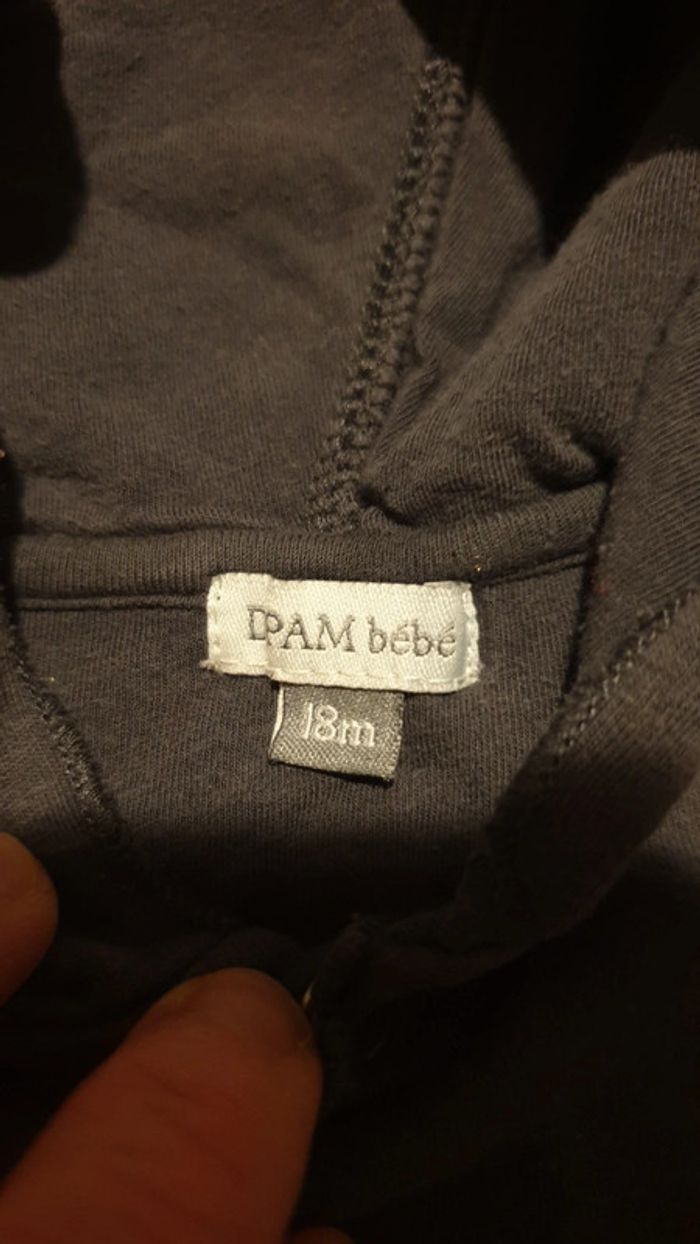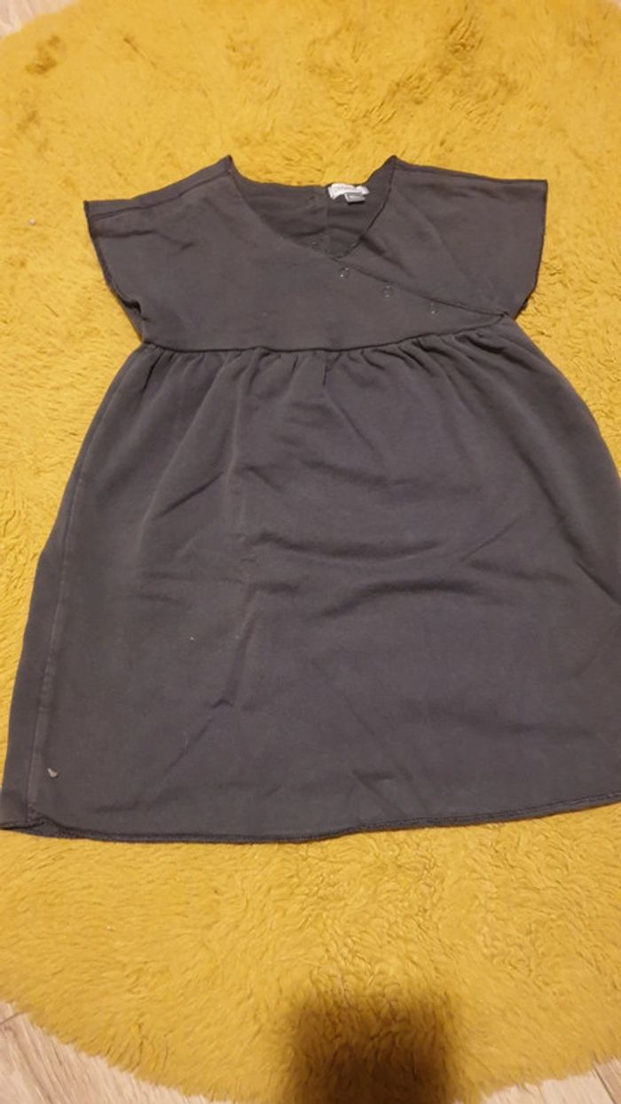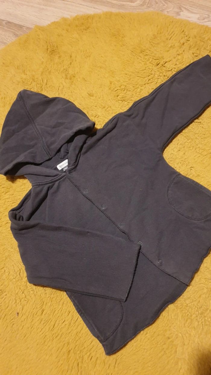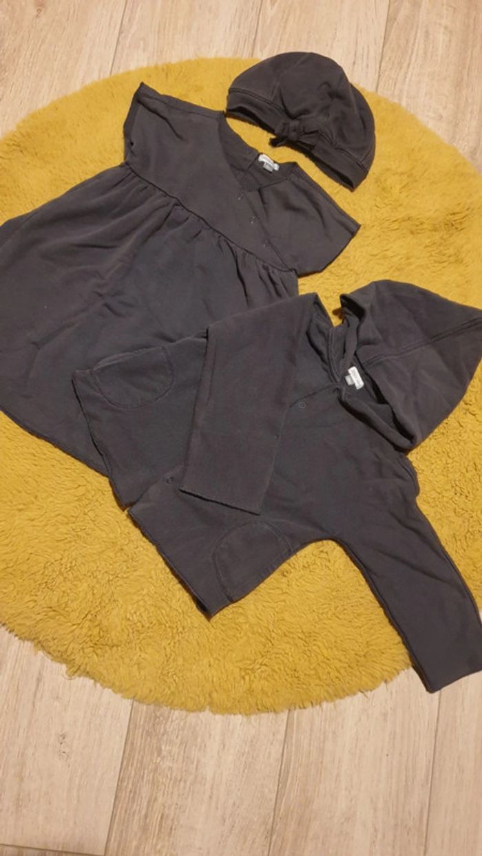 Ensemble 3 pièces hiver. Robe manche courte, sweat à capuche et fermeture pression et le bonnet assorti. 95% coton. Très bon état. Gris foncé. Taille plutôt grand, peut se porter jusqu'à 24 mois. De nombreux articles dans mon dressing. Réductions dès 3 articles !