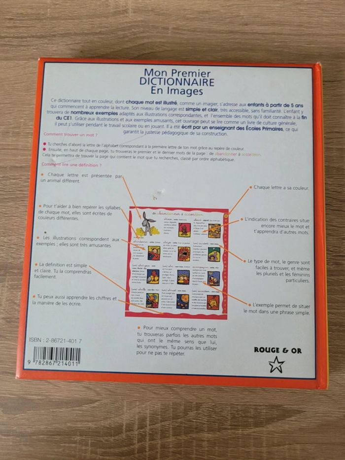 Vend livre "Mon premier dictionnaire en images" en bon état juste des petits défauts (voir photos). Livre définissant 1500 mots avec les illustrations associées en mode imagier pour les enfants à partir de 5 ans. Vendu tel que sur la publication.