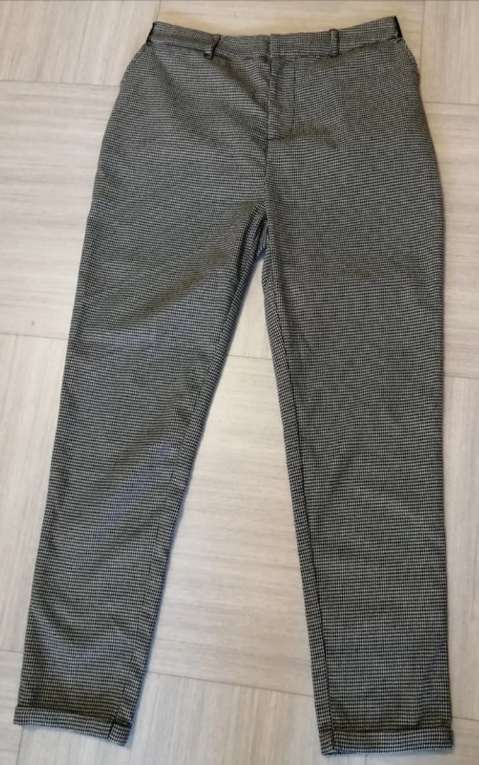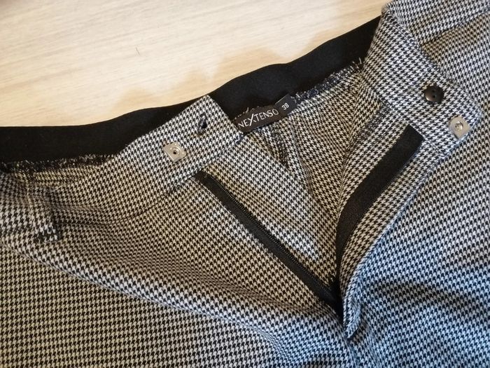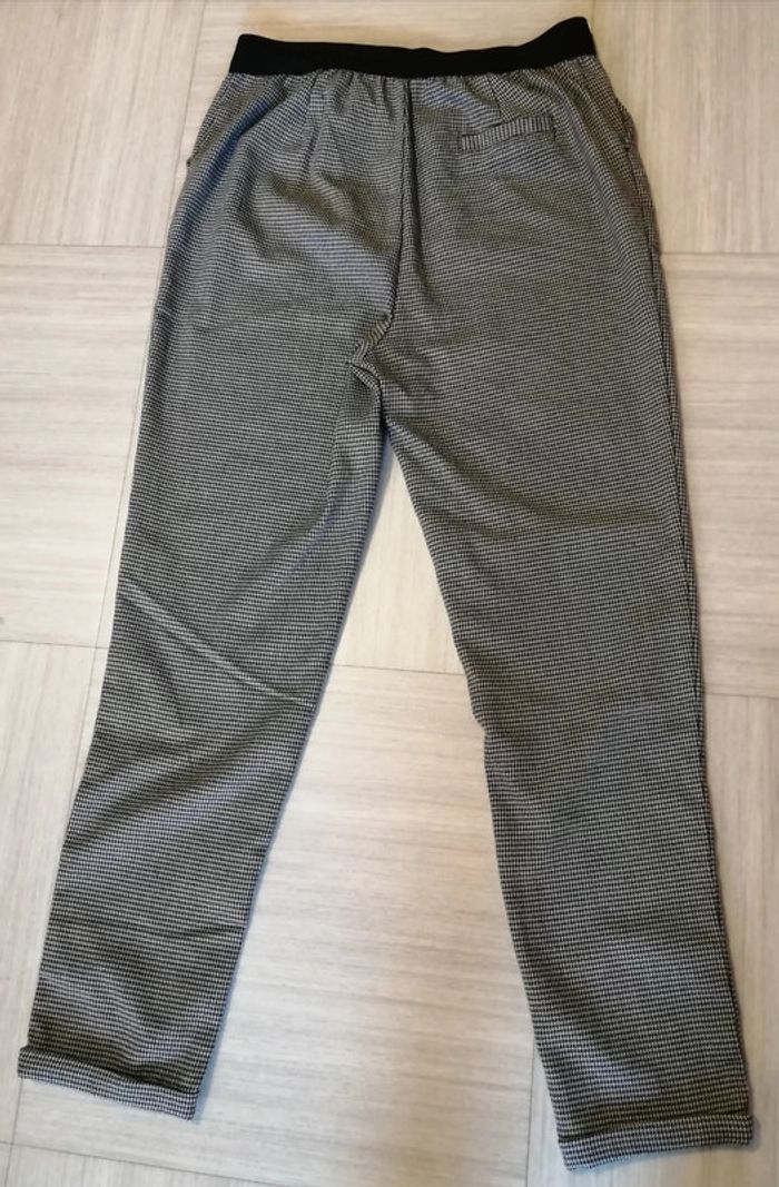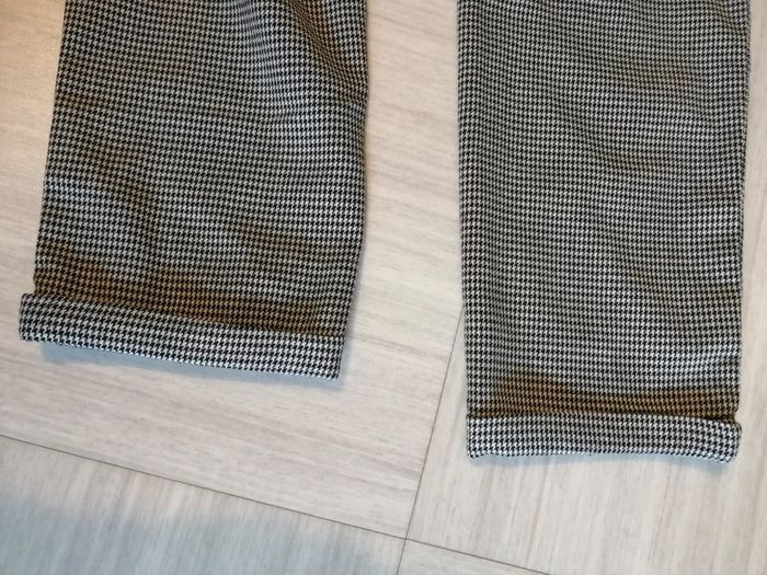 Pantalon noir/blanc plu communément appelé impression pied de poule. Taille 38. 2 poches latérales. Revers d'origine en bas de jambes. Taille elastiquée au niveau du dos. Très bon état.