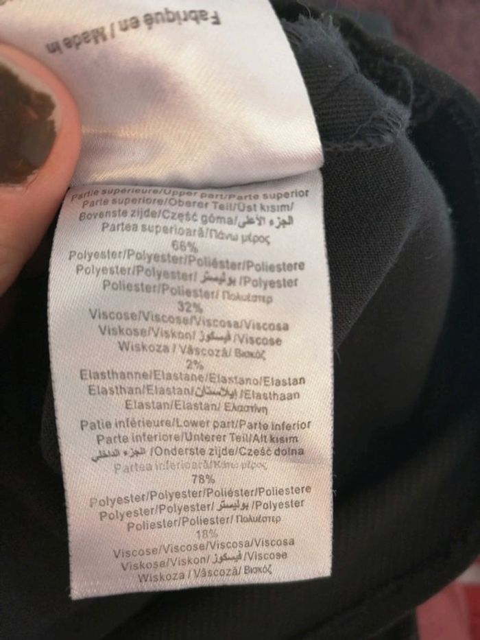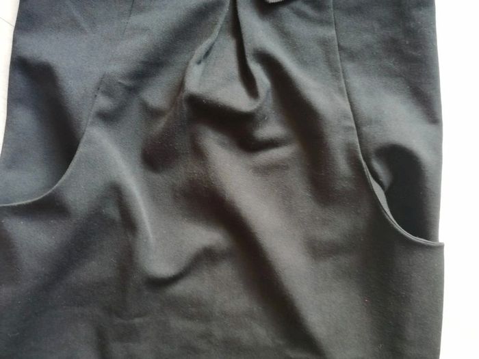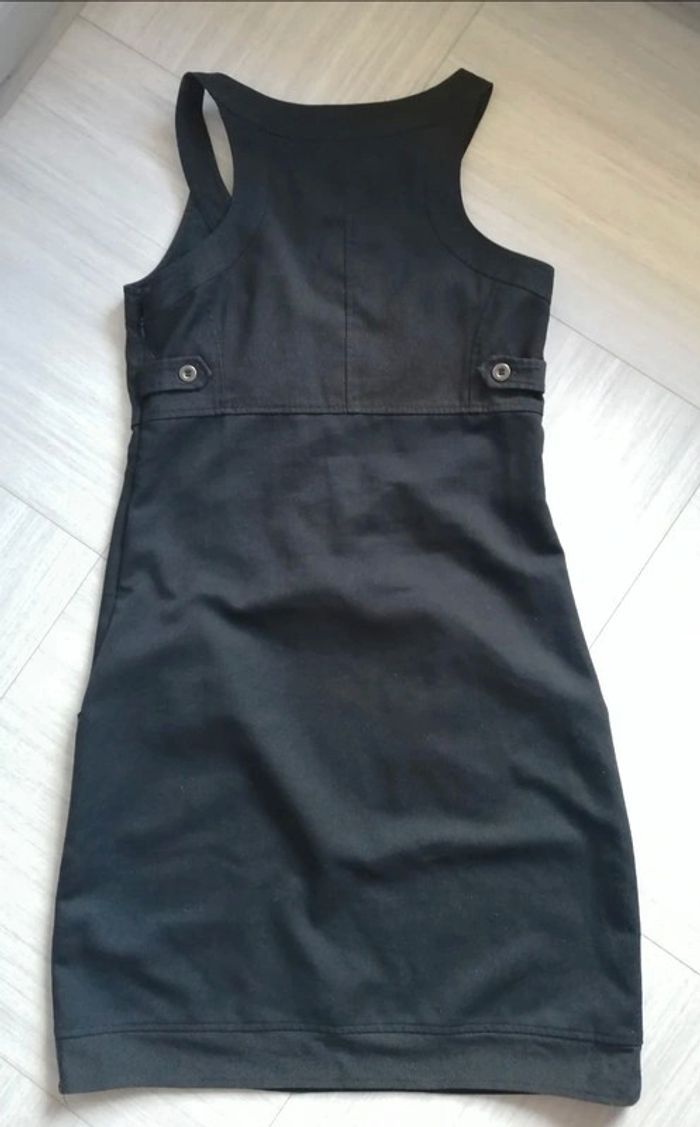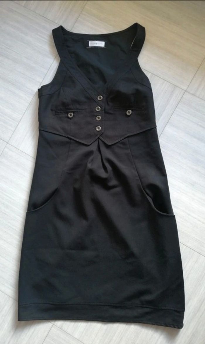 Jolie robe noire et rayée blanche pour la partie du haut ainsi que la bande du bas. Environ 90 cm de long. Fermeture éclair sur le côté. 2 poches latérales. Les boutons niveau poitrine peuvent se détachés. Elle est en très bon état il faut juste recoudre un bouton (voir photo) Elle est de la marque Cache Cache. Taille 36.