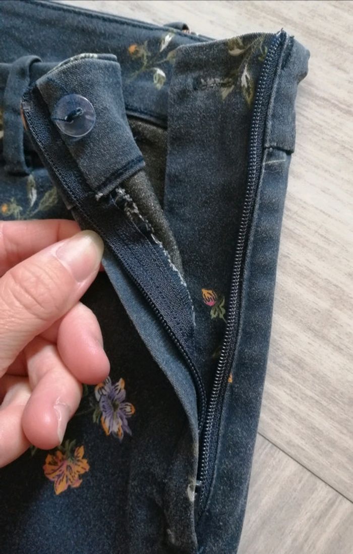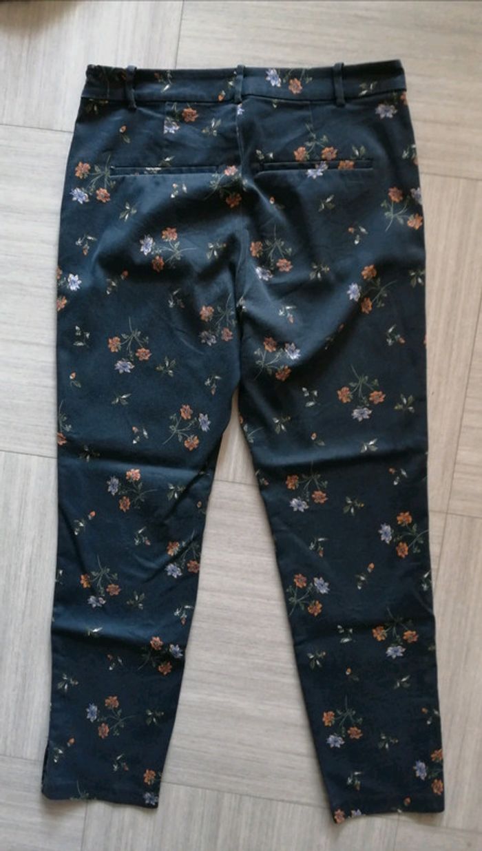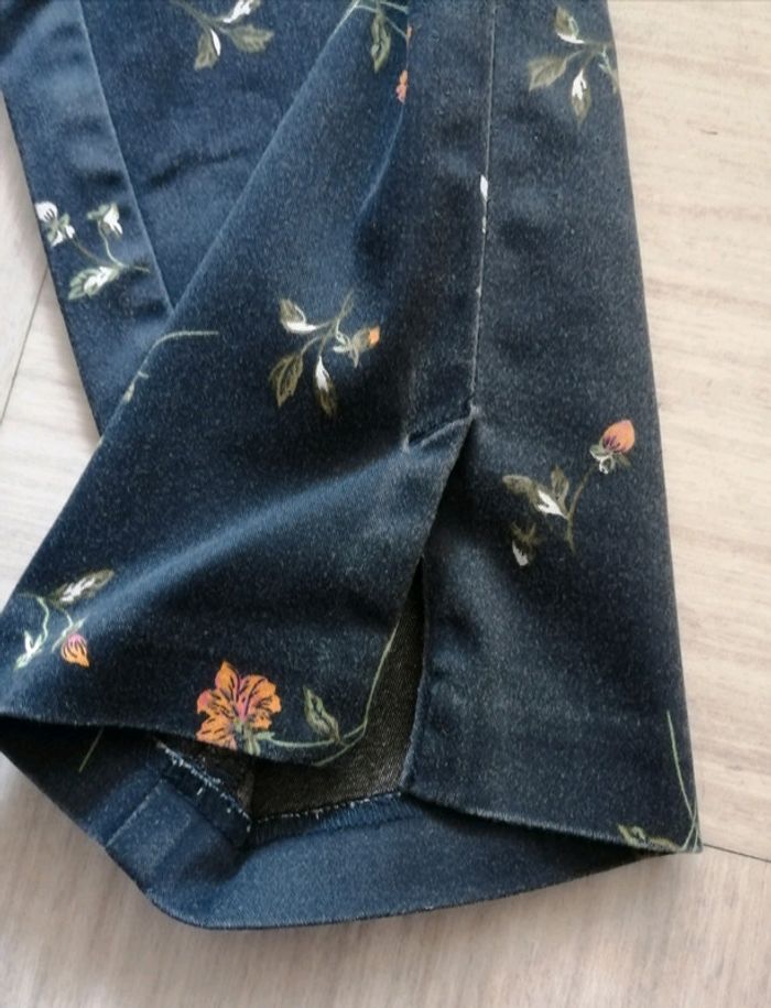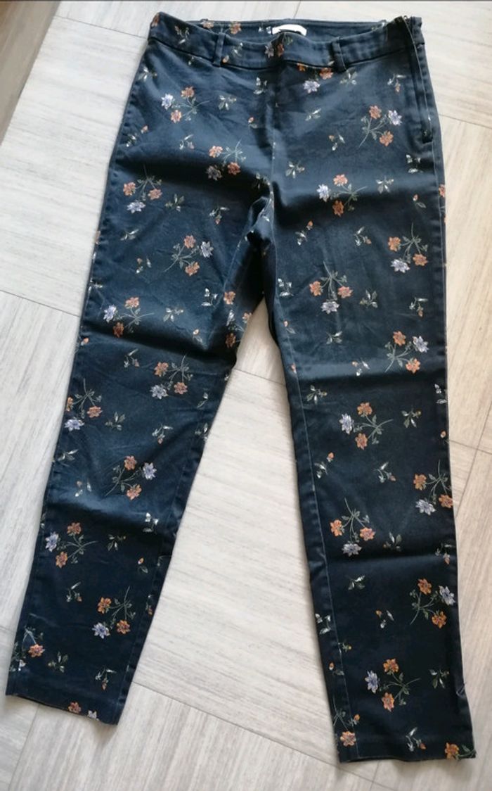Pantalon motifs fleurs, couleur bleu marine de chez H & M, taille 40. Fermeture éclair et bouton sur le côté et petite fente au bas des jambes. 92 cm de longueur totale. Bon état, zéro défaut, juste la couleur un petit peu fade.