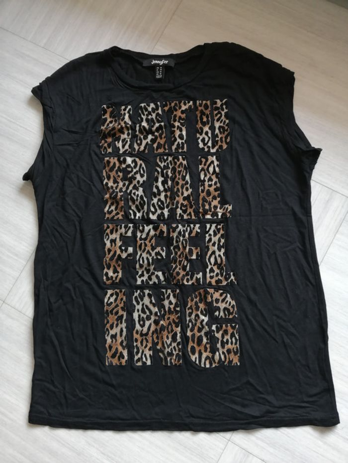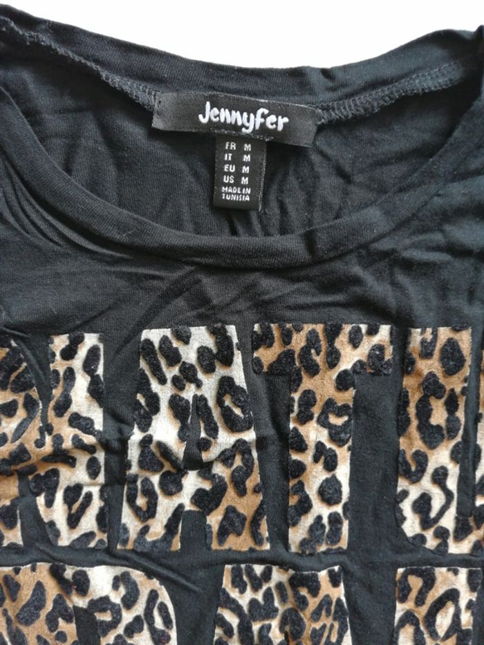Tee-shirt noir, ras de cou, avec écriture léopard, 62 cm de long. Taille M
