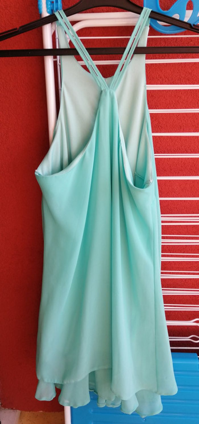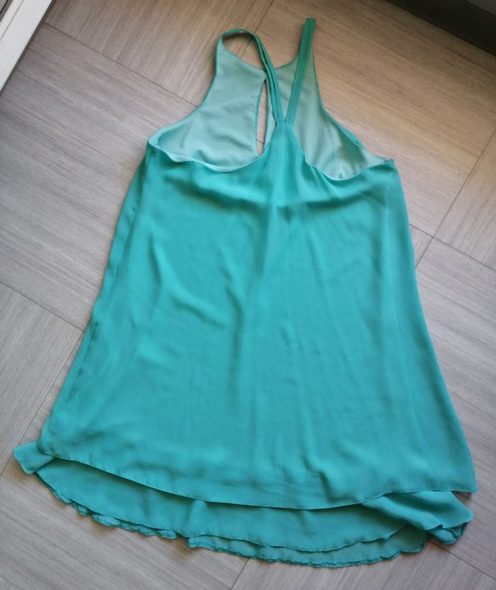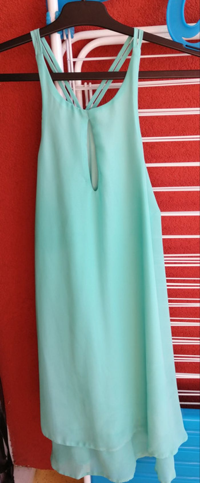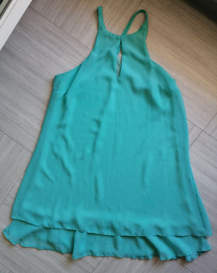 Robe matière légère, voile. Couleur vert d'eau. Longueur environ 82 cm. Indiqué taille S mais correspond plutôt à un 38