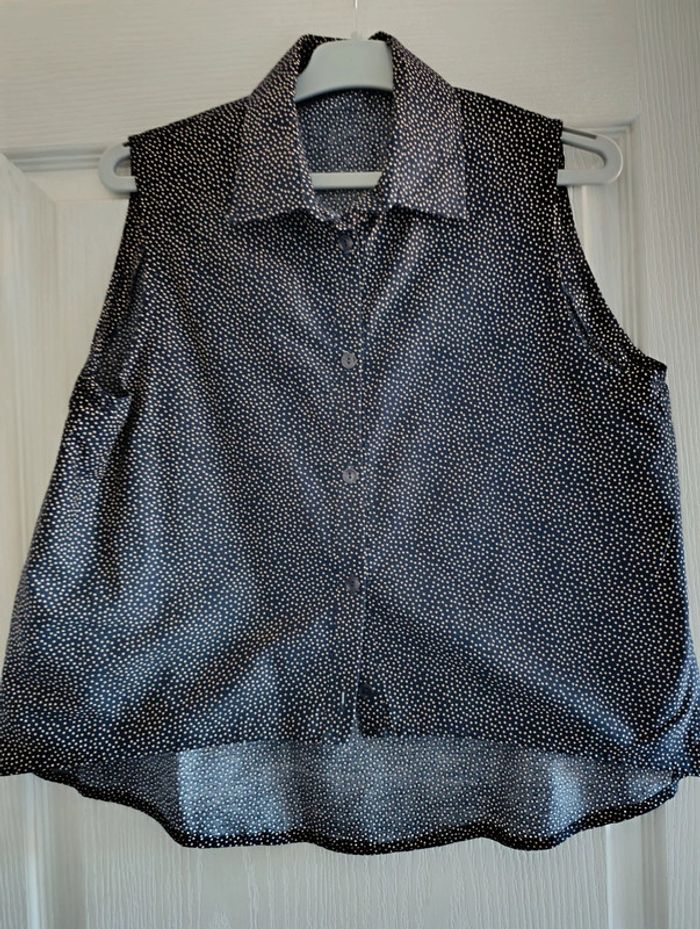 Blouse / chemise sans manche Couleur : bleu marine à pois Boutons sur l'avant Taille S Longueur 58 cm arrière 52 cm avant Largeur sous aisselles 49 cm