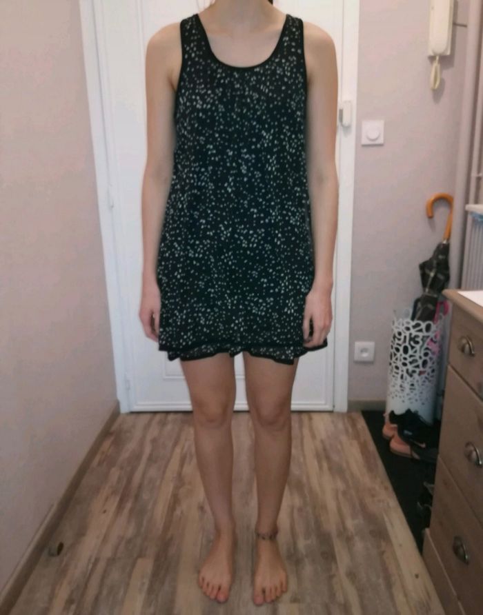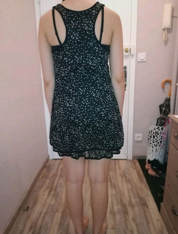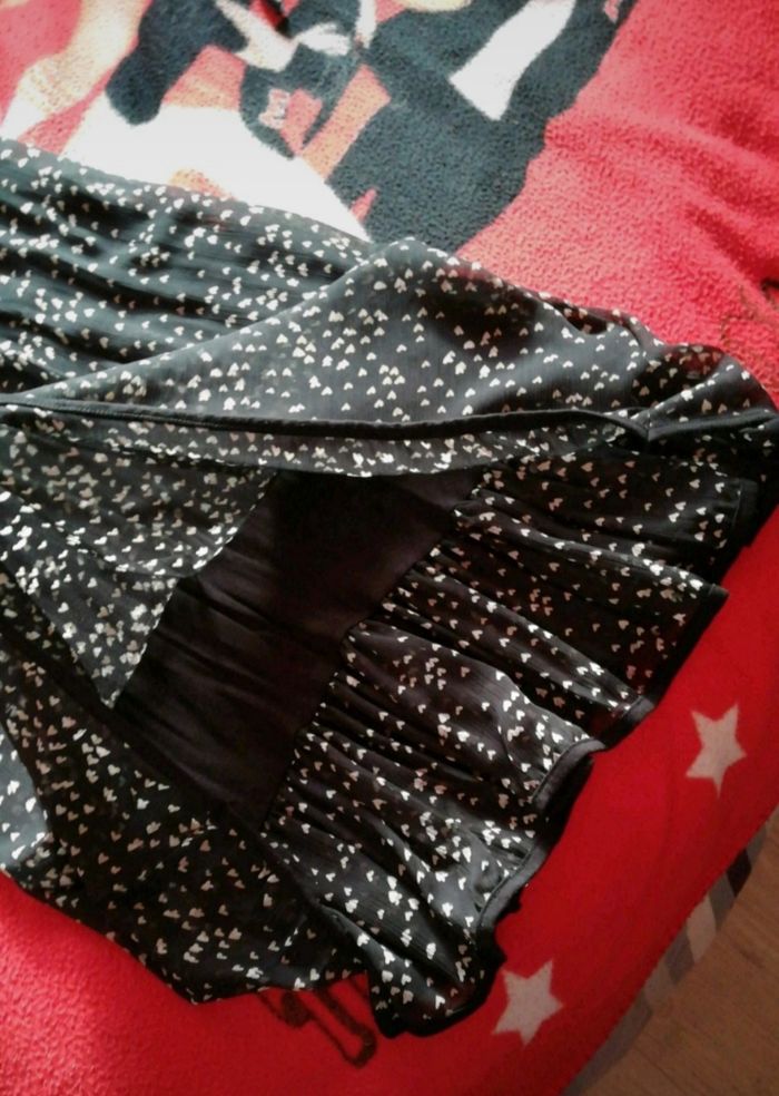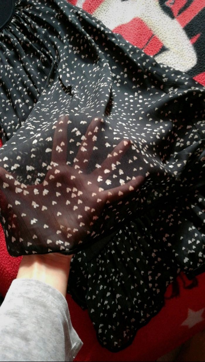 Robe avec imprimé coeur. Il y a une doublure noire opaque en dessous, avec un volant en bas, par dessus il y a un voile noir transparent avec motif coeur marron Taille 14 ans (plutôt grand)