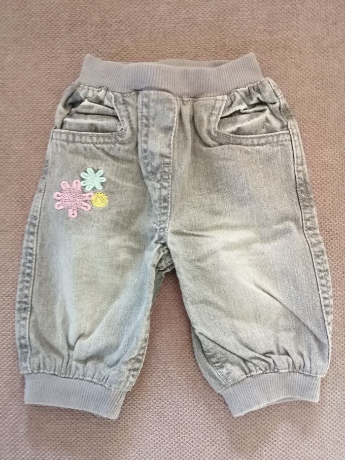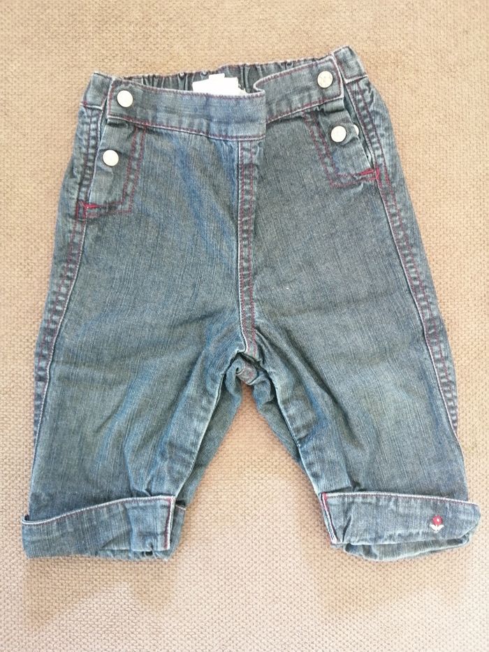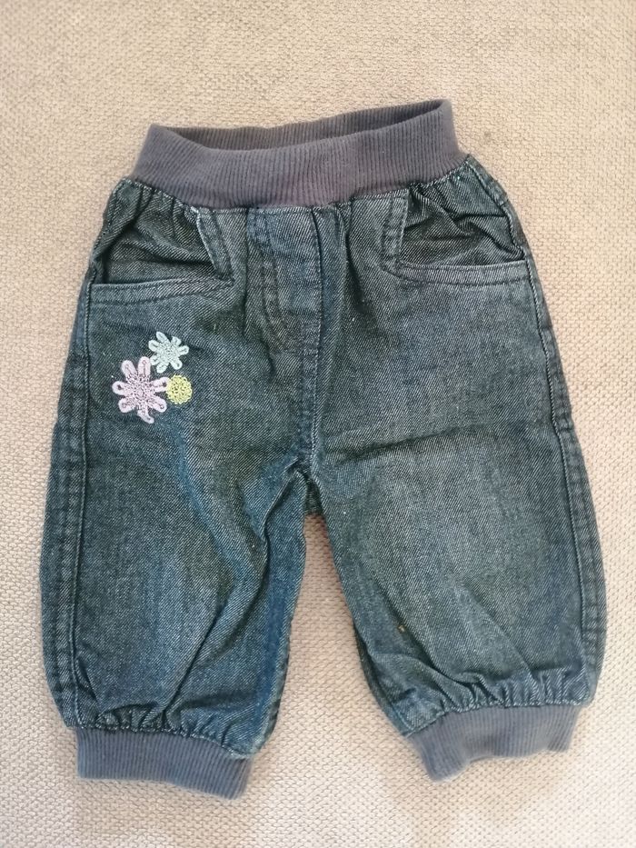Lot de 3 jeans fille 6mois, 1 jacadi avec pression entre les jambes et 2 jeans orchestra avec broderies fleurs.