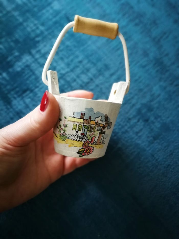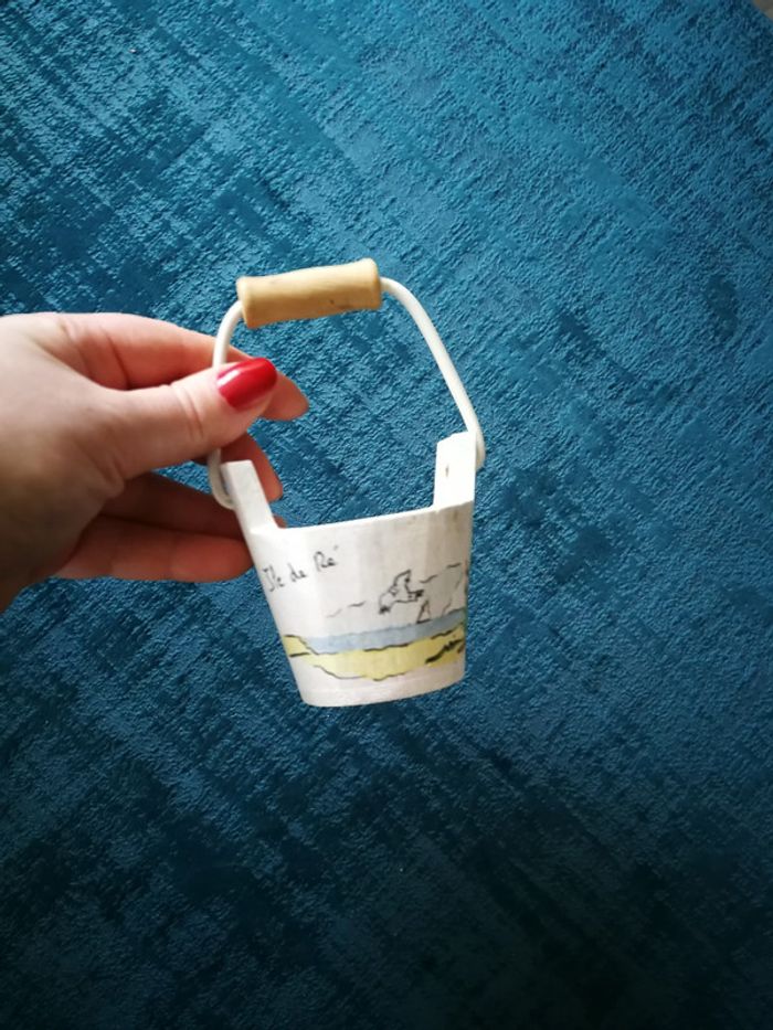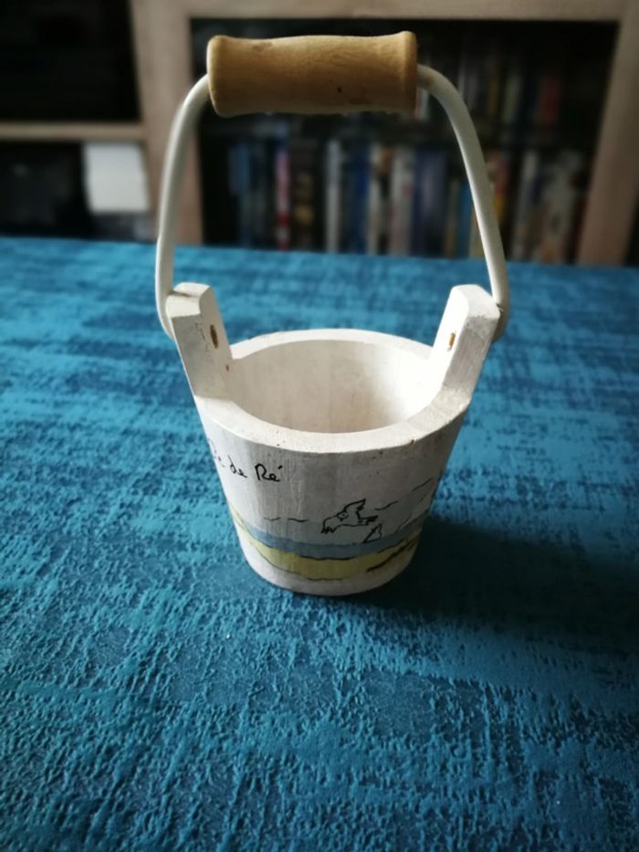 Petit seau décoratif en bois blanc avec des motifs et une inscription lle de Ré. Dimensions: 12 cm hauteur avec le poignée, 7 cm sans poignée, 4,5 cm diamètre. Poids 40g. En très bon état général, la peinture est un peu craquelée. Pensez à faire des lots afin de bénéficier des remises que j'ai régulièrement sur ma page. #seauenbois #seaublanc #seaublanc #bibelot #jouetenfants