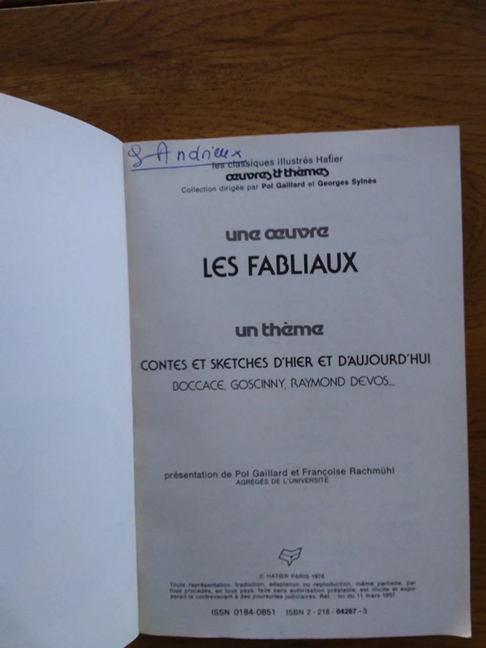 UN Thème Auteur(s) : GAILLARD Pol - RACHMUHL Françoise Editeur : Editions Hatier Parution : 01/01/1992 Format : Moyen, de 350g à 1kg Envoi rapide #Les_Fabliaux #Livre #GAILLARD_Pol #ald198103 #laurent87700 #lacavedu87